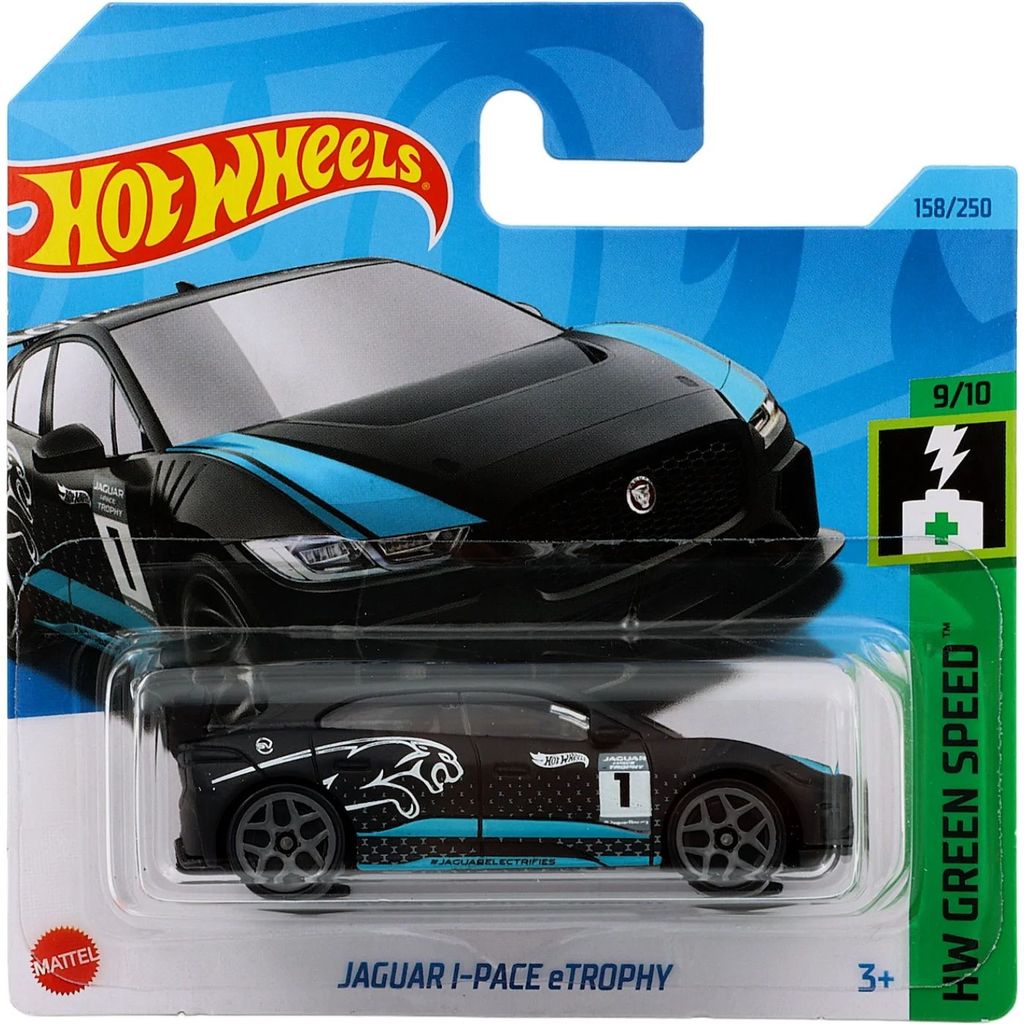 Jaguar I-Pace eTrophy från Hot Wheels och serien HW Green Speed där denna leksaksbil är bil nummer 9/10. Bilen är nummer 158/250 från 2023 och har ett short card (5785).