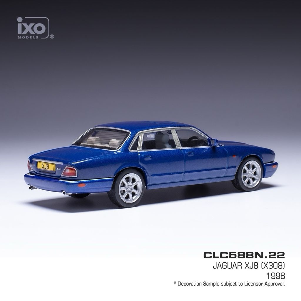 Modellbilen levereras i en akrylbox sående på en svart bottenplatta med texten "CLC588N.22 - Jaguar XJ8 (X308) - 1998".