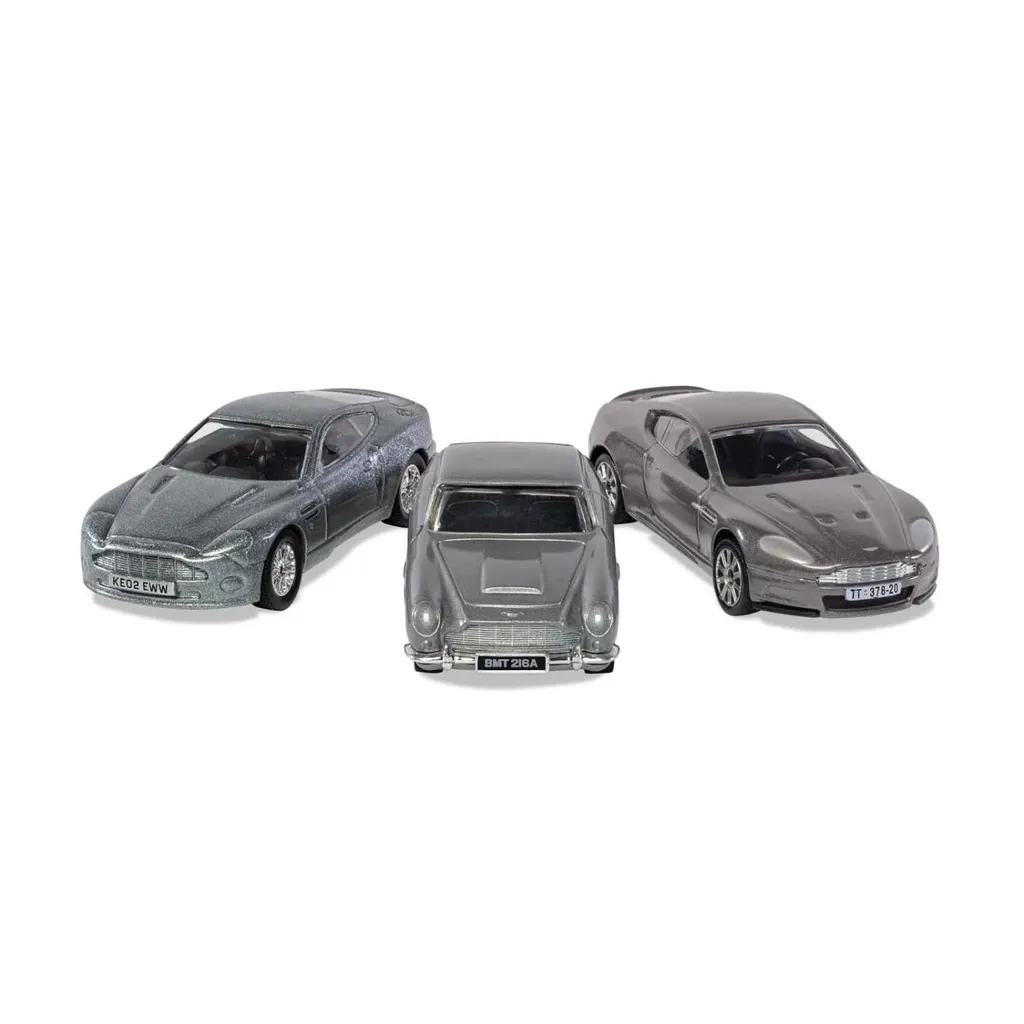 Set med tre Aston Martins som körts av James Bond 007. Modellerna är DB5, V12 Vanquish och DBS.