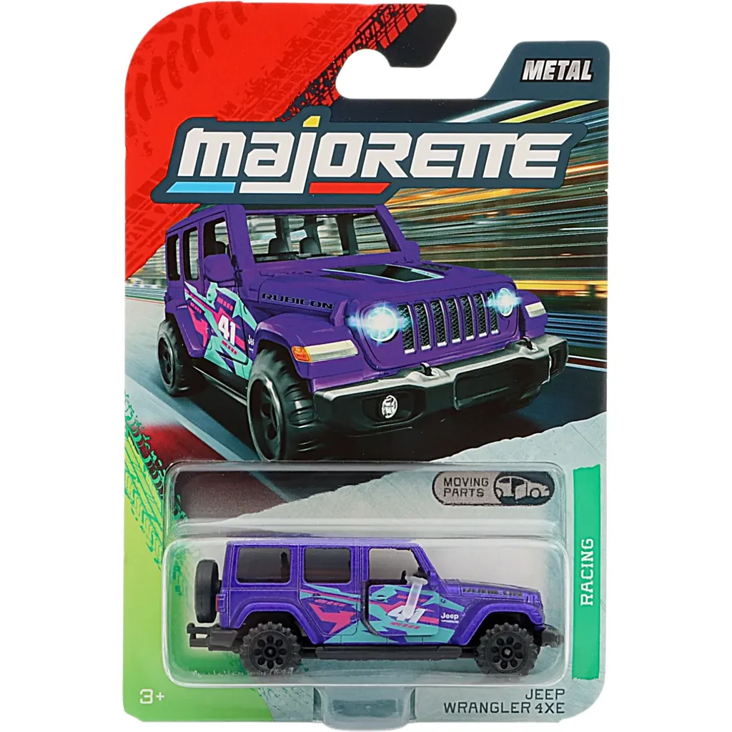 Jeep Wrangler 4XE från Majorette och serien Racing Premium Cars. Bilen är 7 cm lång och tillverkad i metall med plastdetaljer.