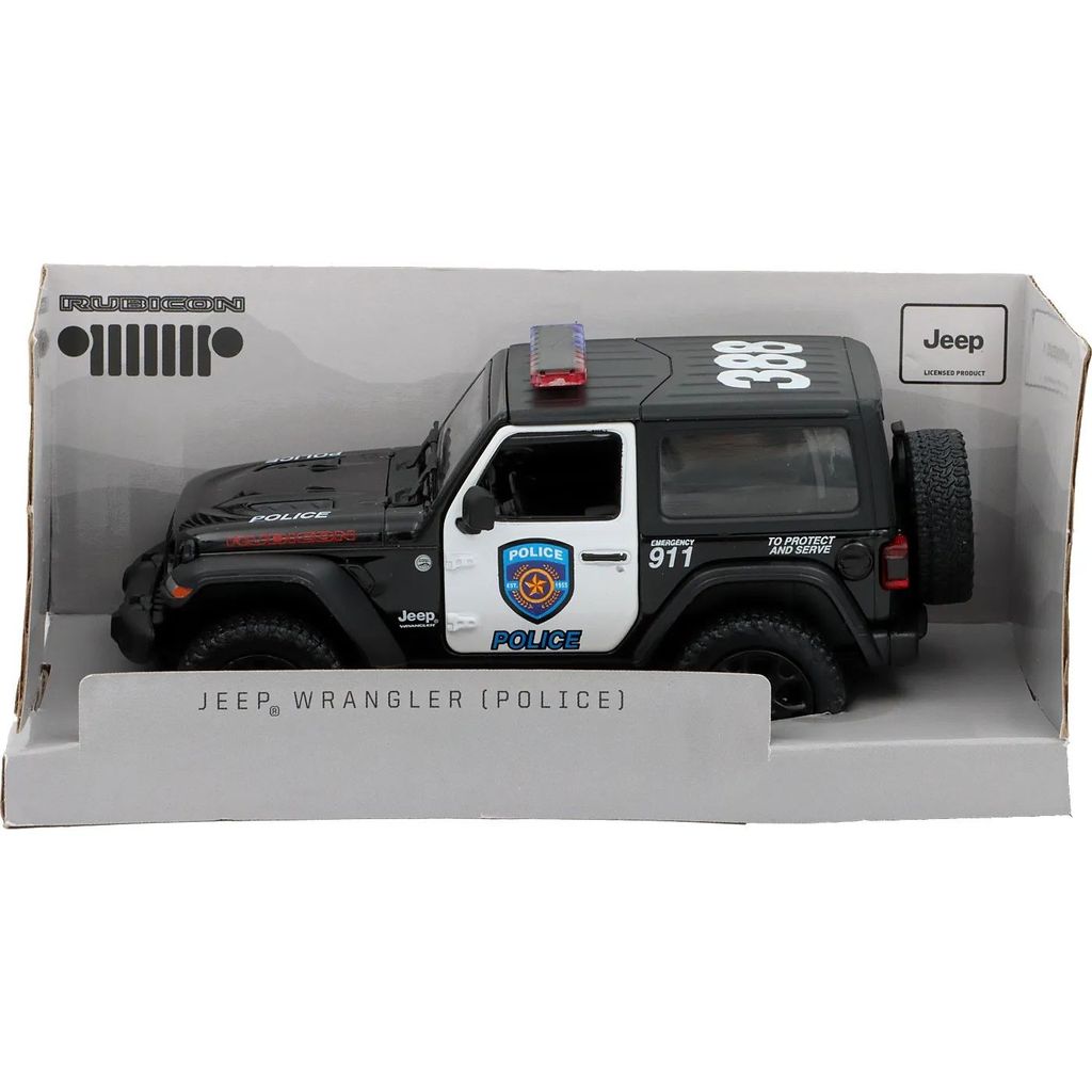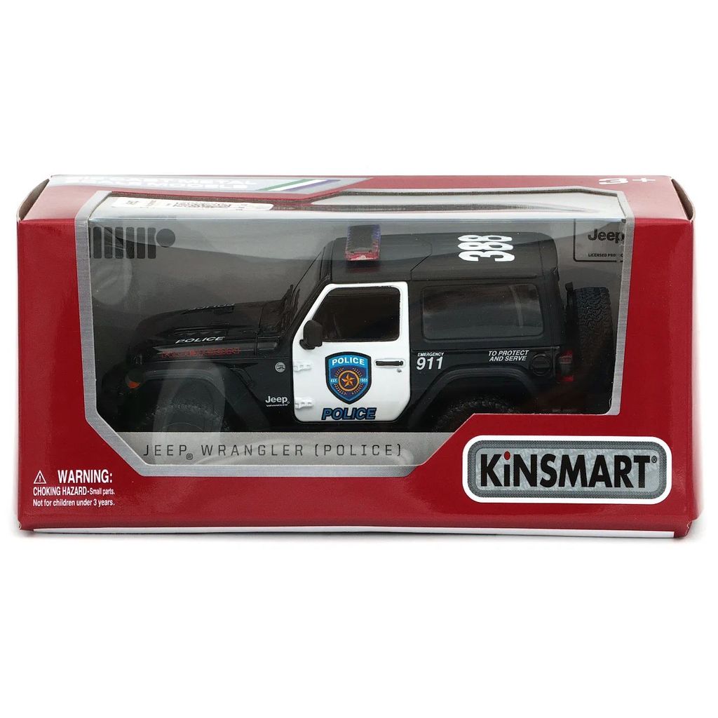 Jeep Wrangler som polisbil från Kinsmart. Bilen levereras i en fin förpackning med fönster.