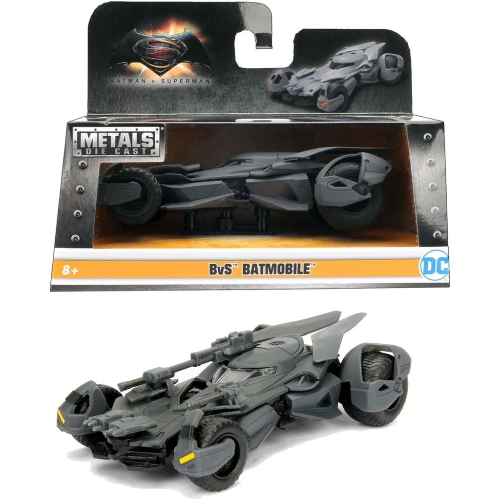 Justice League Batmobile som modell och leksaksbil från Jada Toys i skala 1:32 (längd ca 13 cm).