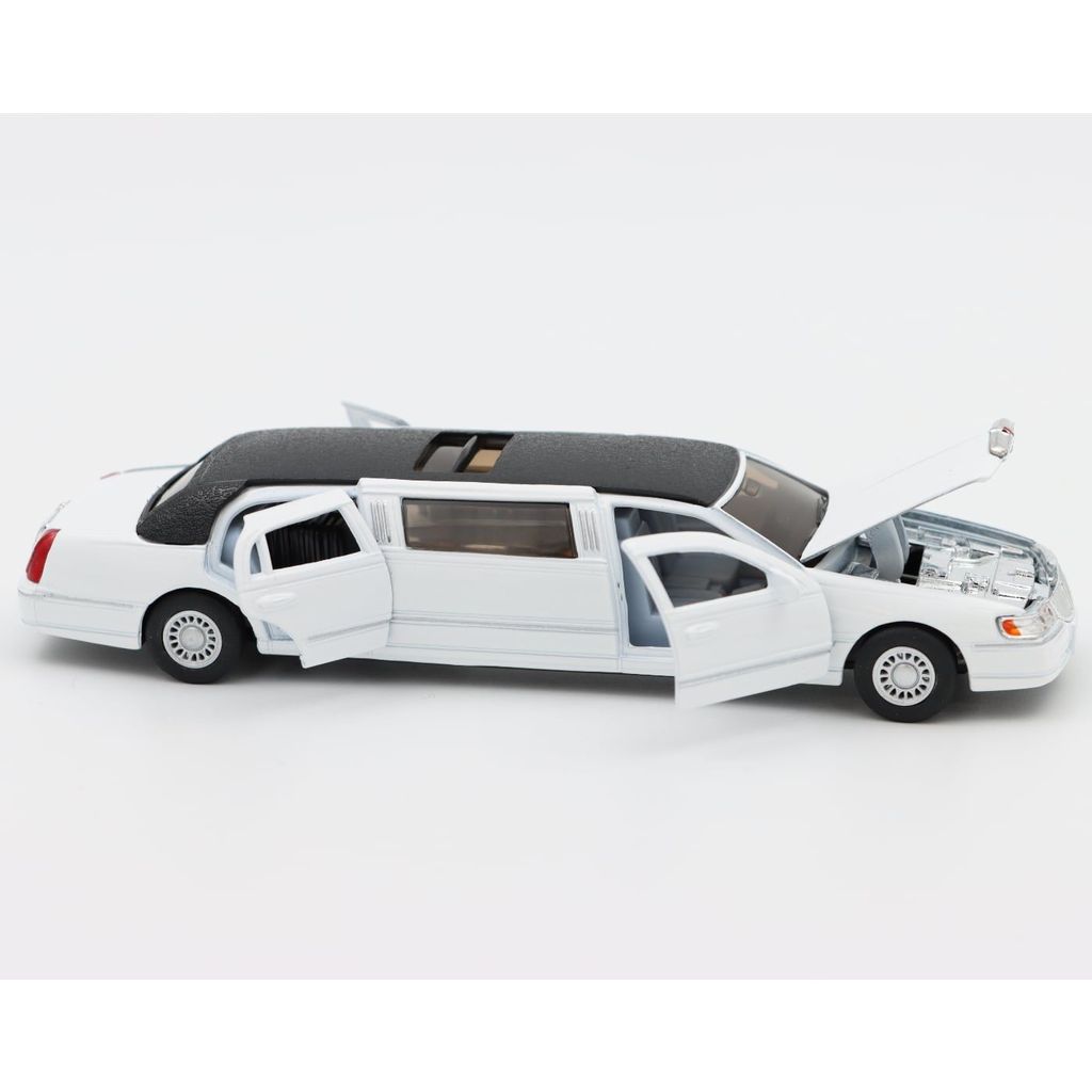 Kinsmart 1999 Lincoln Town Car Stretch Limousine skala 1:38 med pullback och öppningsbara dörrar, taklucka och motorhuv.