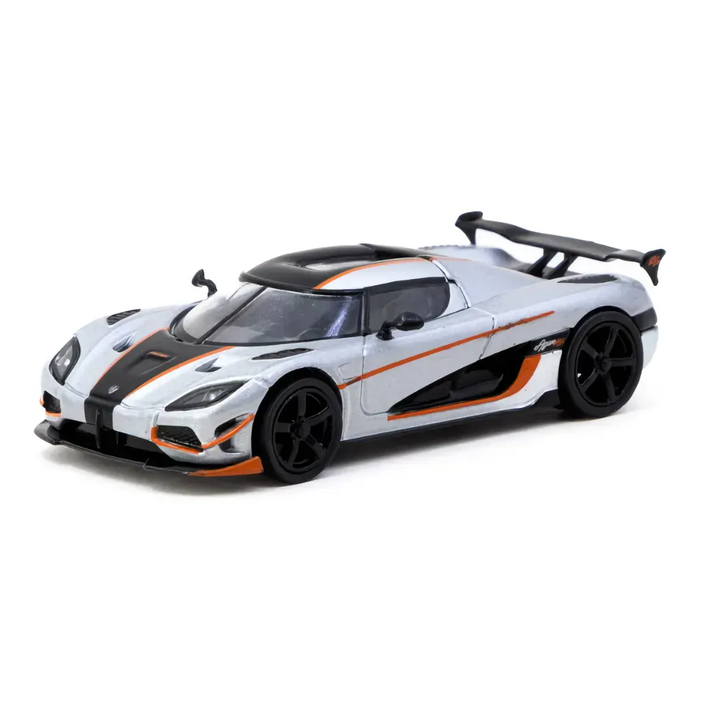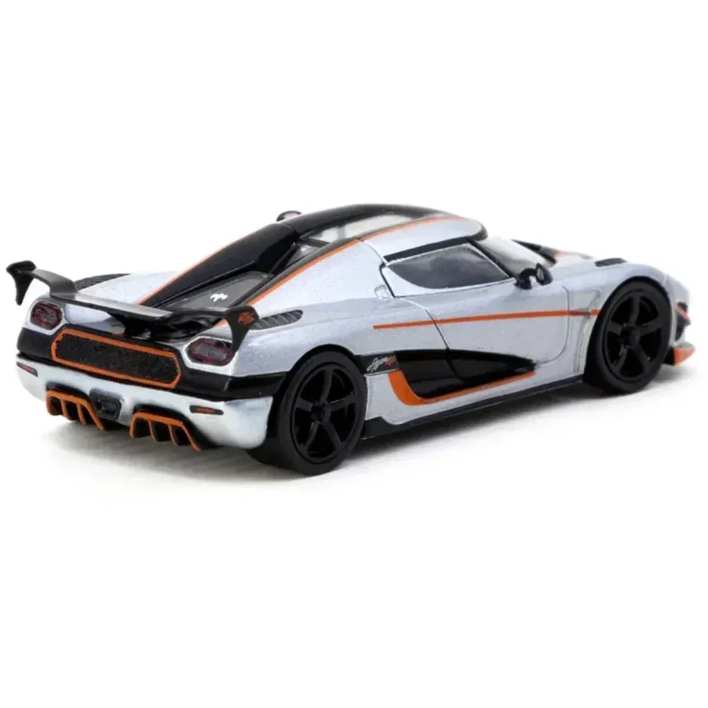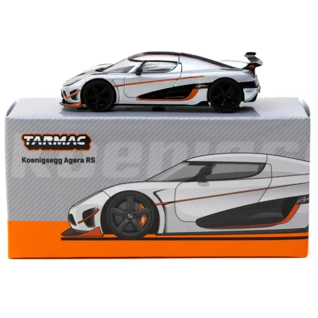 Koenigsegg Agera RS med en silverlack (Moon Silver) med svarta och orange inslag. Modellen är tillverkad av Tarmac Works och ingår i serien GLOBAL64. Skalan är 1:64 vilket i detta format kan översättas till ca 7 cm.