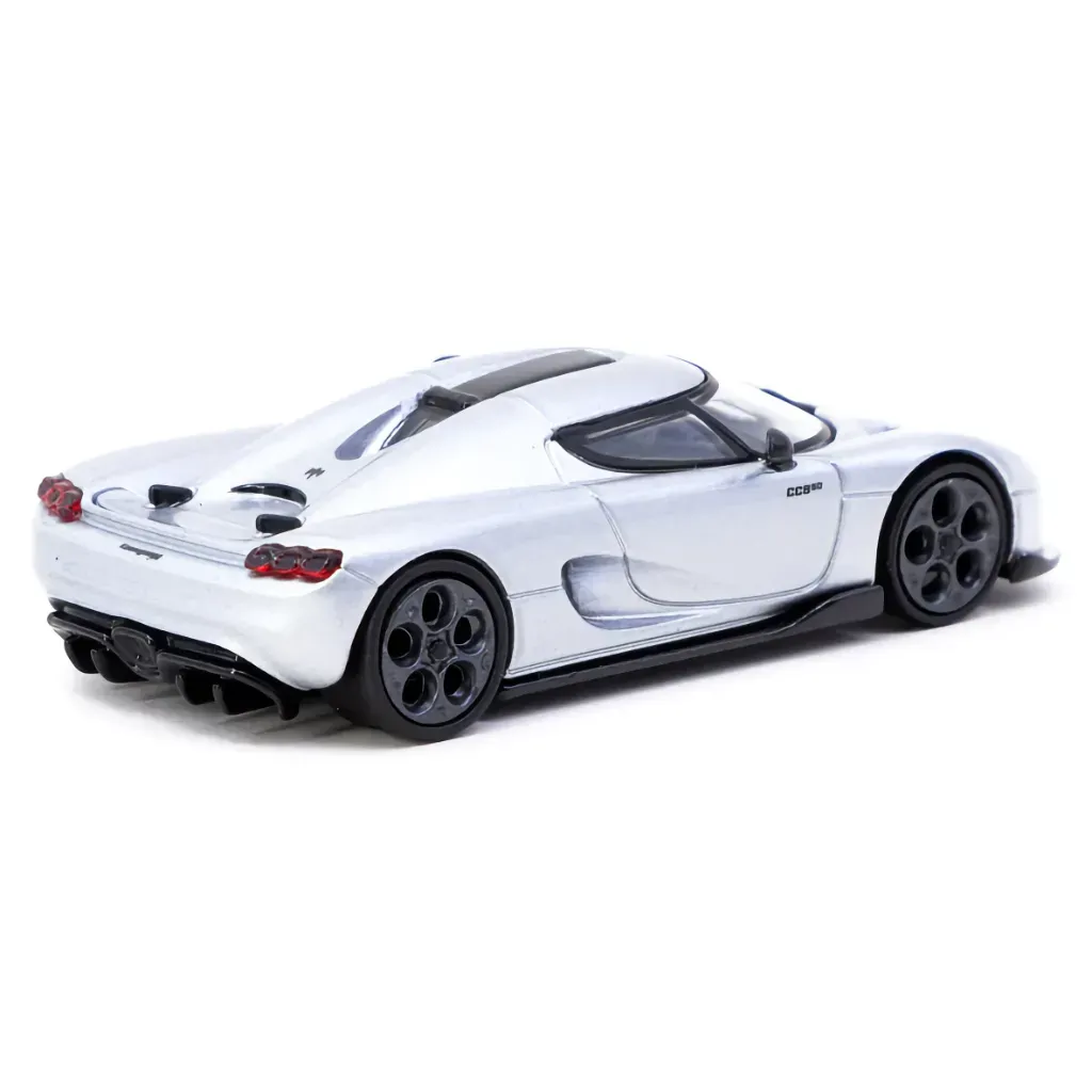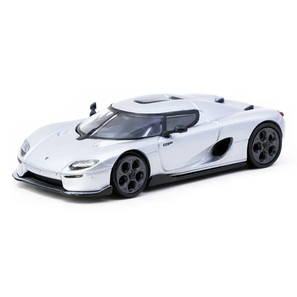 Silverfärgad Koenigsegg CC850 från modellbilstillverkaren Tarmac Works och serien GLOBAL64 i skala 1:64 (ca 7 cm).
