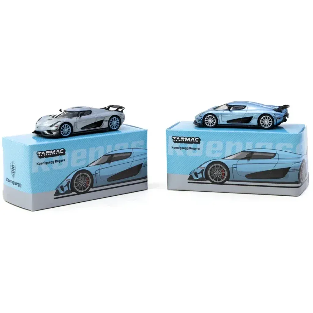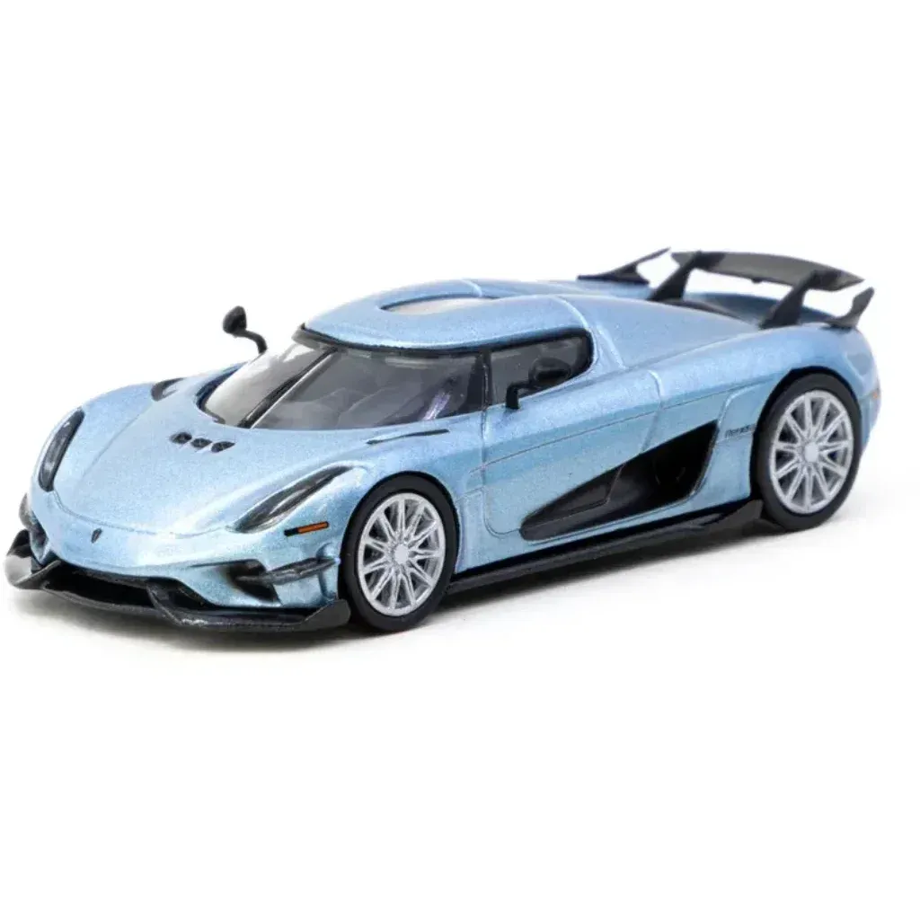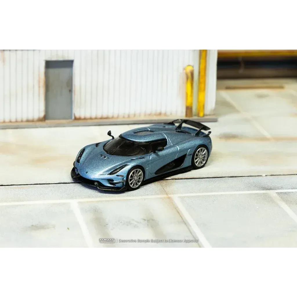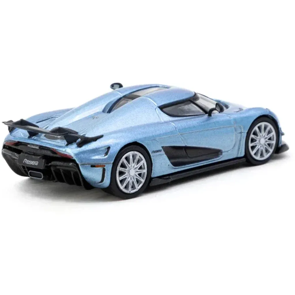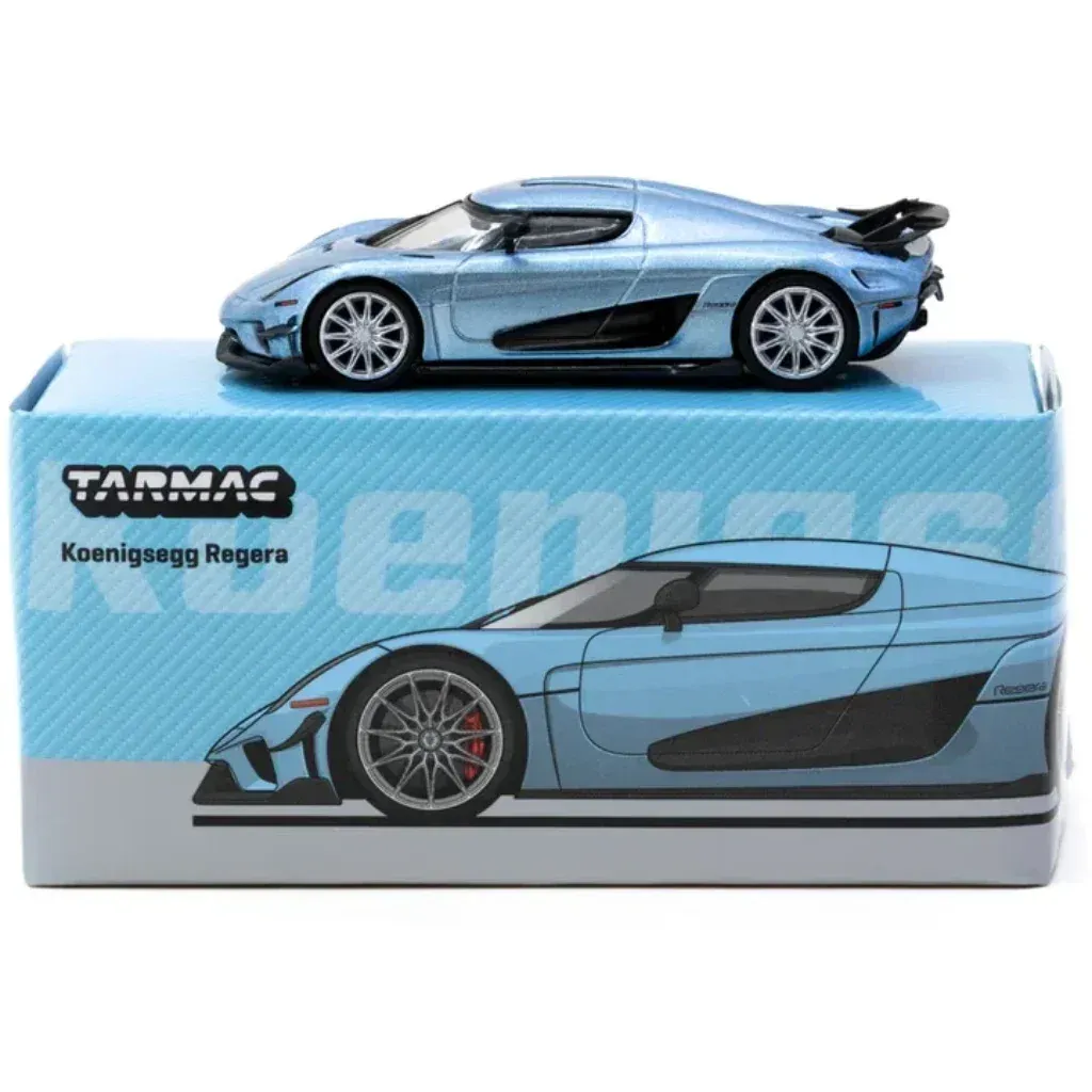 Ljusblå (metallic) Koenigsegg Regera från Tarmac Works i skala 1:64 (ca 7 cm). Bilen ingår i Tarmacs serie GLOBAL64.