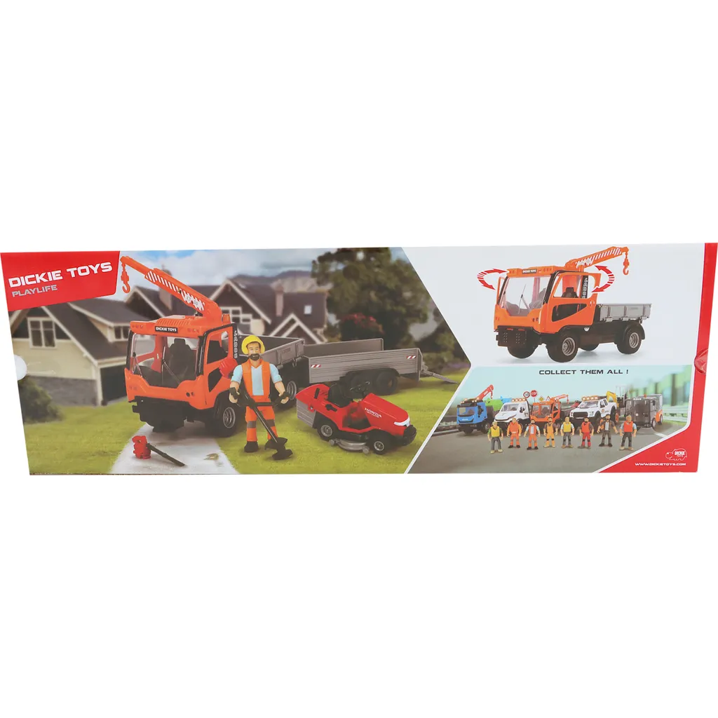 Trädgårdsset med kranbil och gräsklippare samt en figur med tillbehör från Dickie Toys.