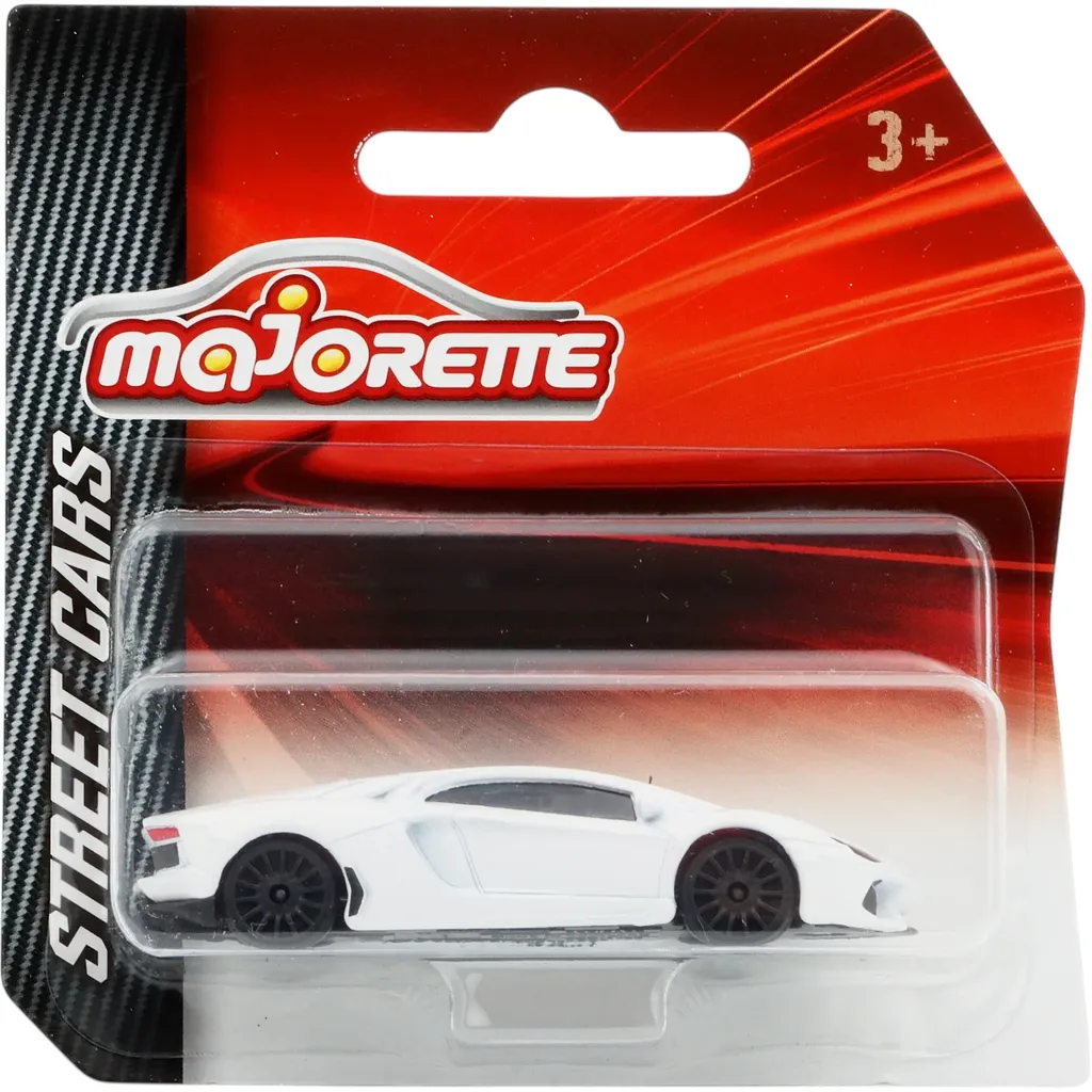 Lamborghini Aventador med vit lack från Majorette och serien Street Cars. Bilen är tillverkad i metall med plastdetaljer och rekommenderas från 3 år.
