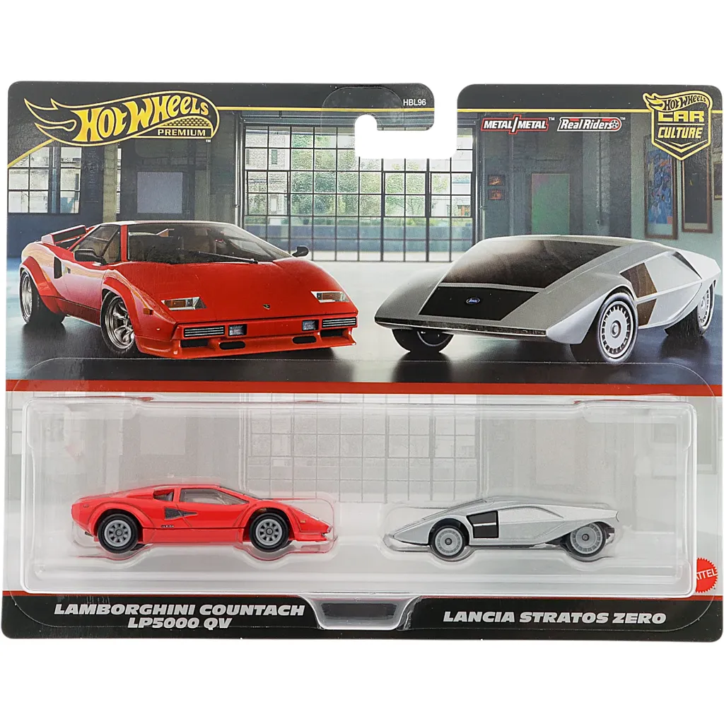 2-pack med en röd Lamborghini Countach LP5000 QV och en silverfärgad Lancia Stratos Zero från Hot Wheels och serien Car Culture.