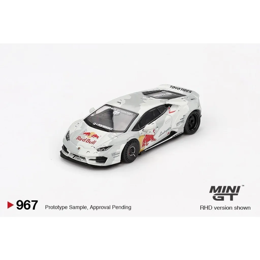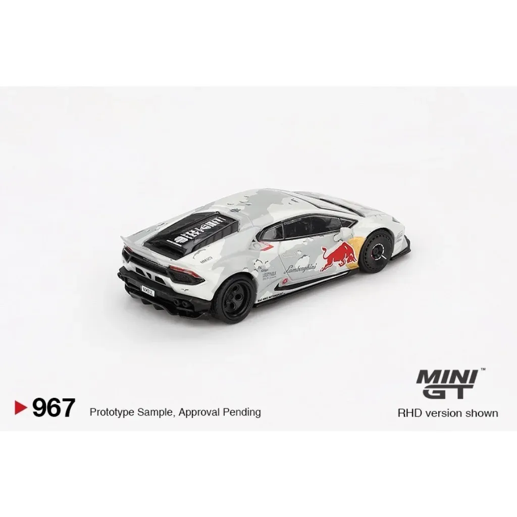 Lamborghini Huracan som modell från Mini GT i skala 1:64 (ca 7 cm). Bilen har en grå-vit kamouflagelack med ett body kit från Liberty Walk.