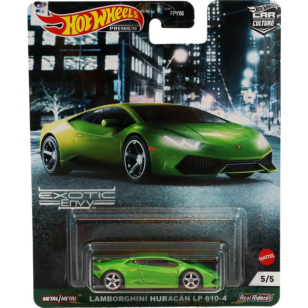 Grön Lamborghini Huracán LP 610-4 från Hot Wheels. Bilen ingår i serien Car Culture: Exotic Envy från 2021 där denna Lambo är bil nummer 5 av 5.