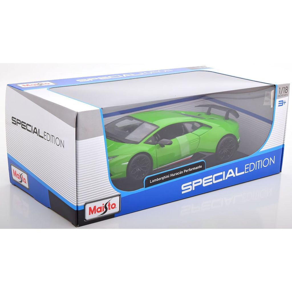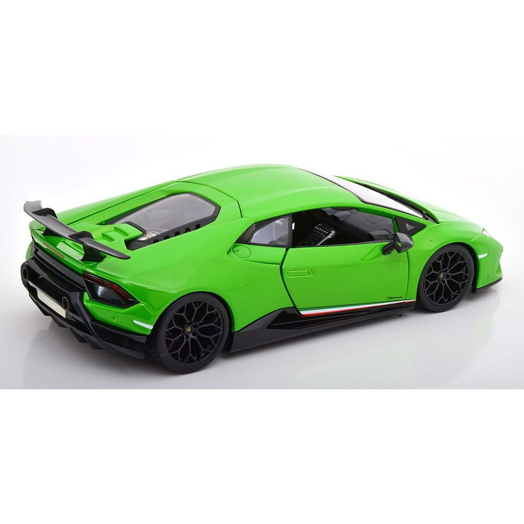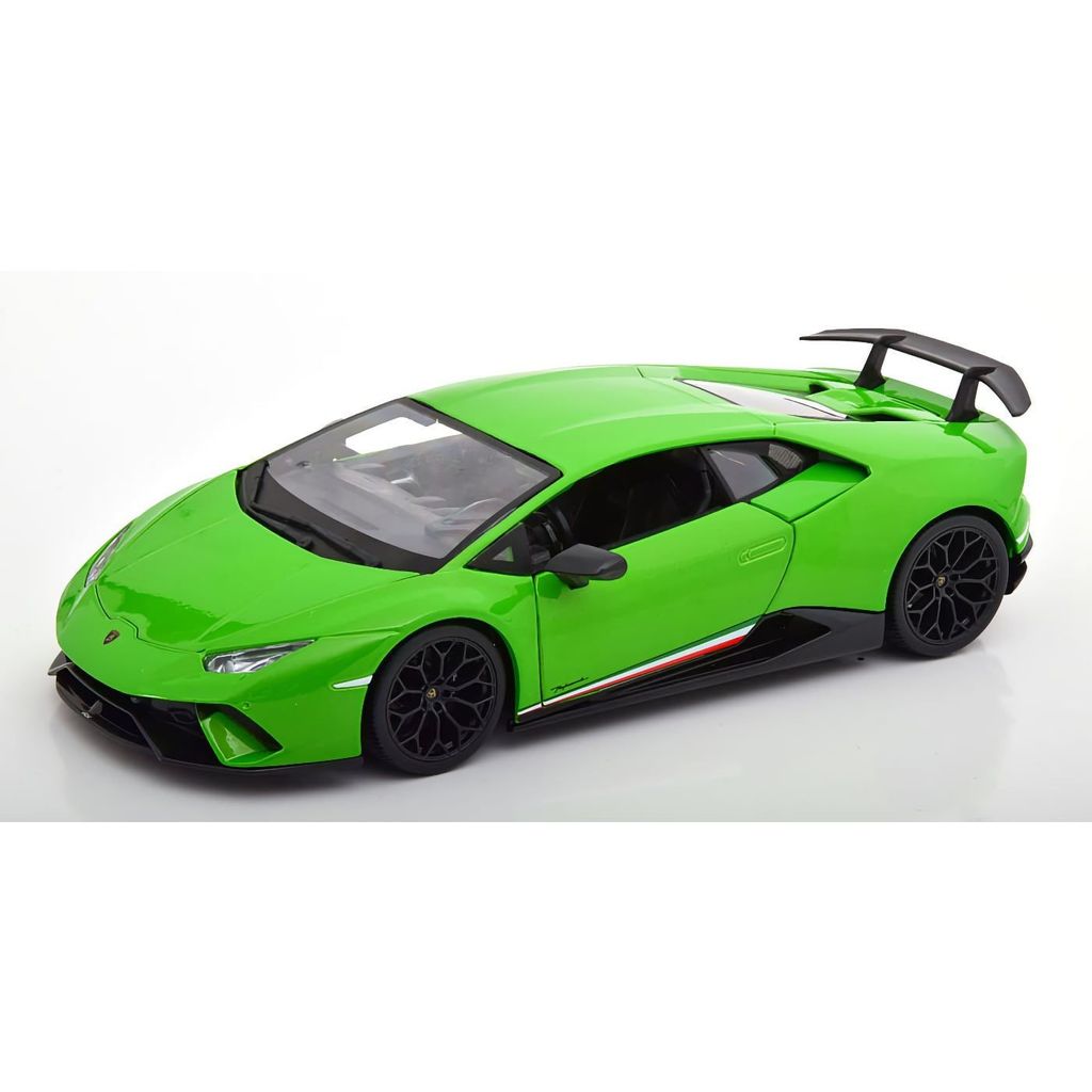 Modellbil i metall (die-cast) från Maisto i form av supersportbilen Lamborghini Huracán Performante i skala 1:18 (ca 24 cm lång). Färgen är grönmetallic och bilen har öppningsbara dörrar, framlucka och motorlucka bak.