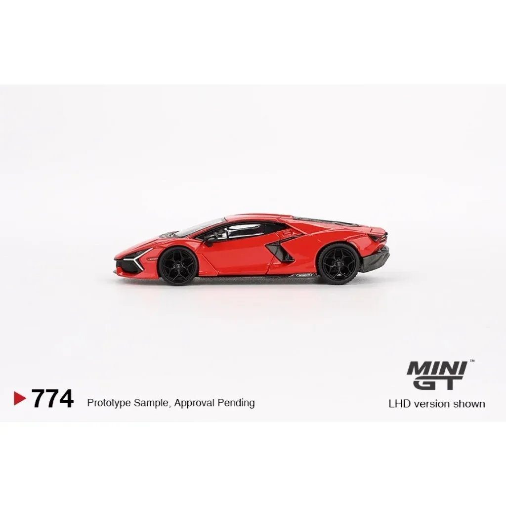 Lamborghini Revuelto som modell tillverkad av Mini GT i skala 1:64 (ca 7 cm). Den röda färgen heter Arancio Dac Lucido.