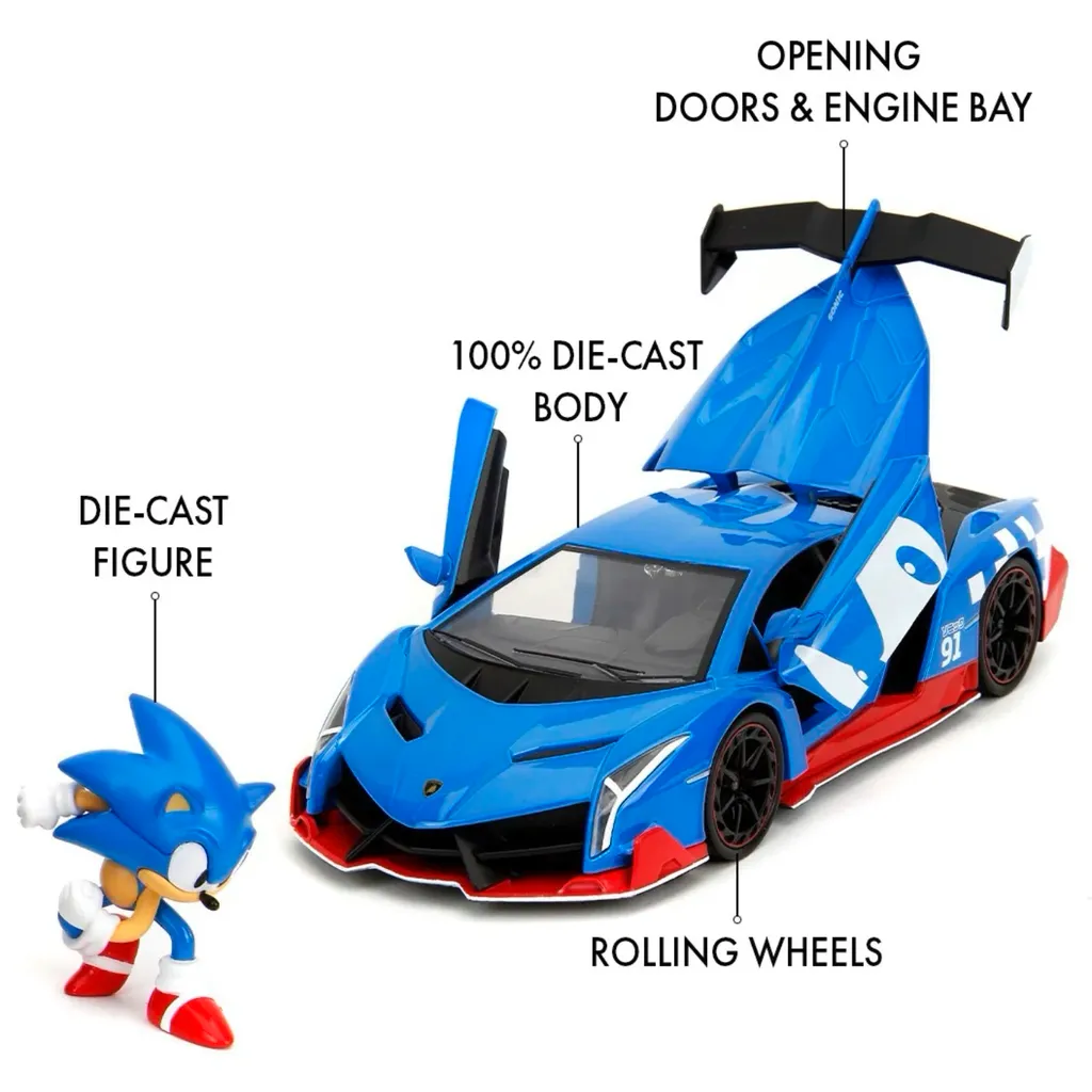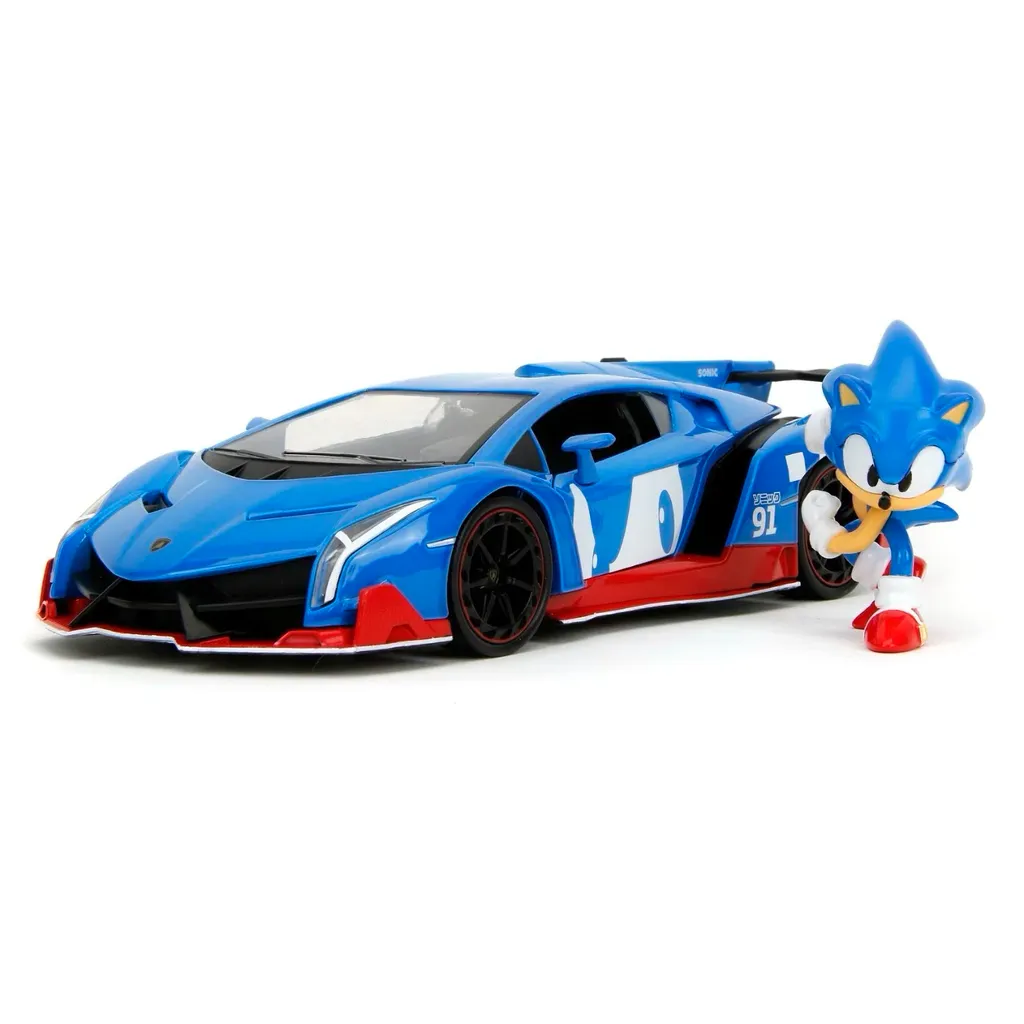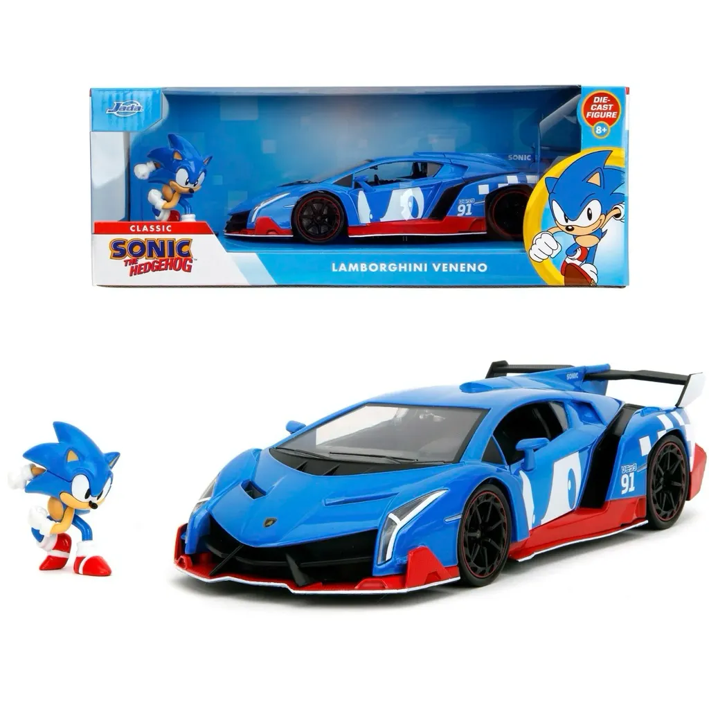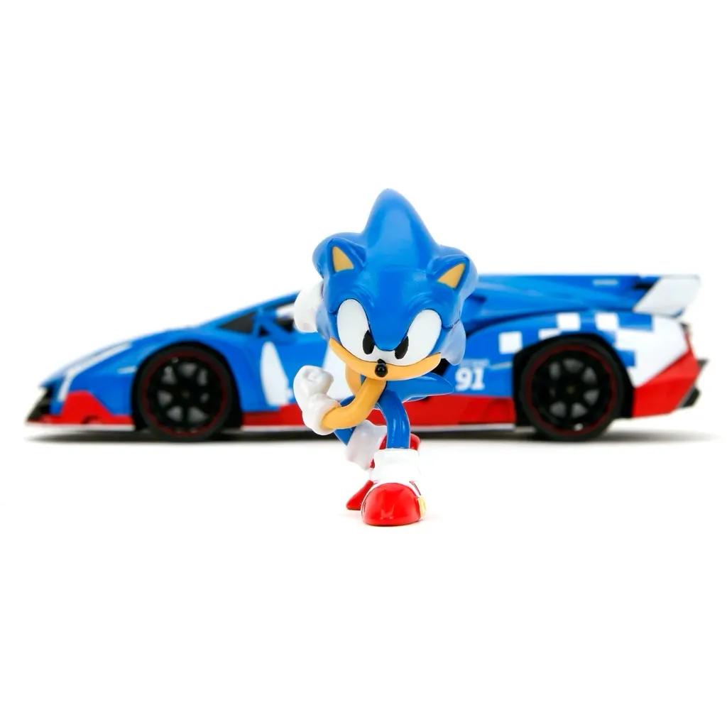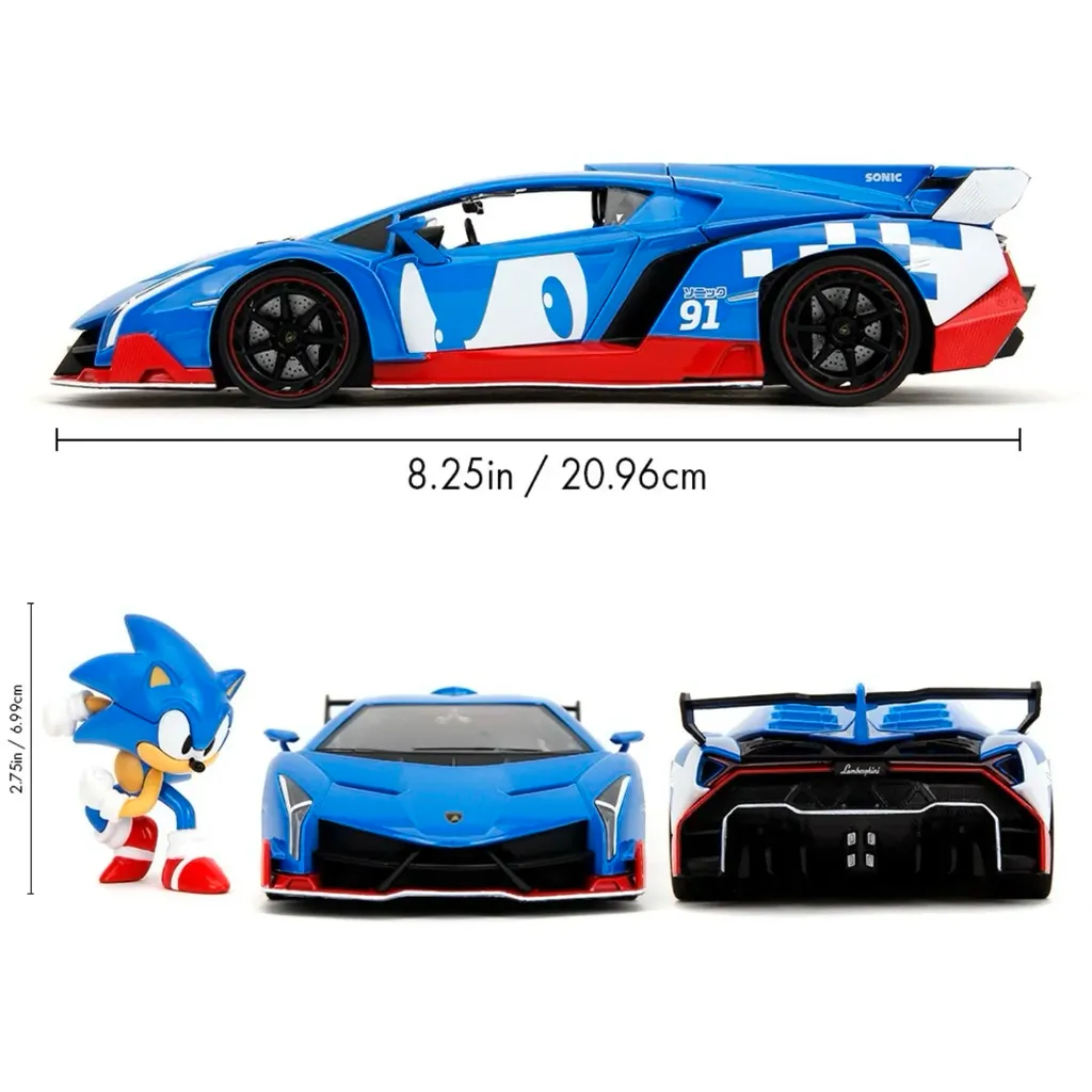 Tv-spels-karaktären Sonic the Hedgehog som metallfigur tillsammans med en blå Lamborghini Veneno i skala 1:24 (21 cm). Produkten är framtagen och tillverkad av Jada Toys.