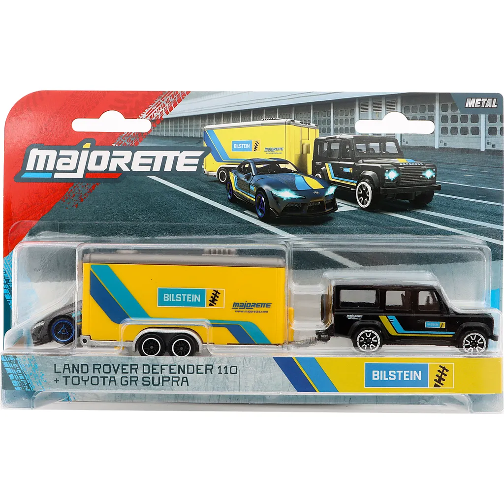 Race Trailer från Majorette med en svart Land Rover Defender 110 som drar en täckt trailer med en gul och blå Toyota GR Supra. Bilarna bildar raceteamet Bilstein.