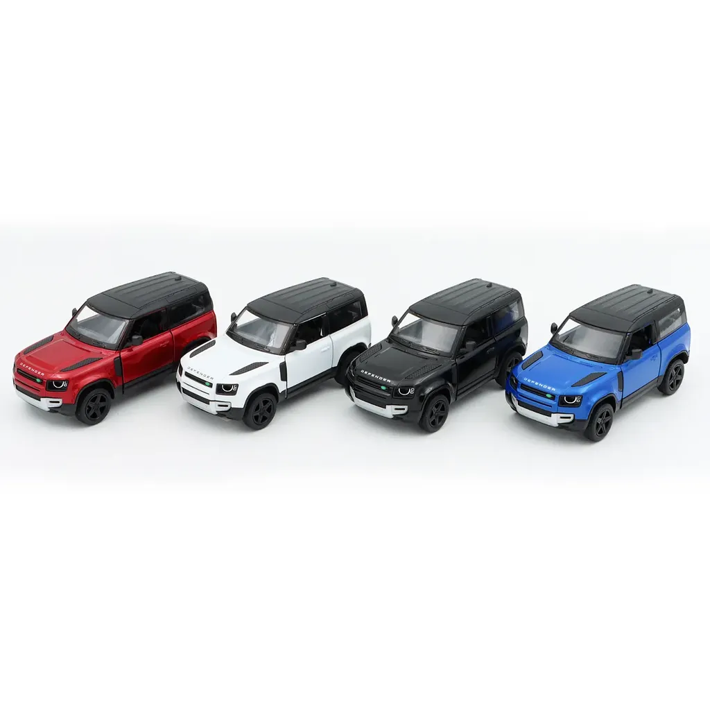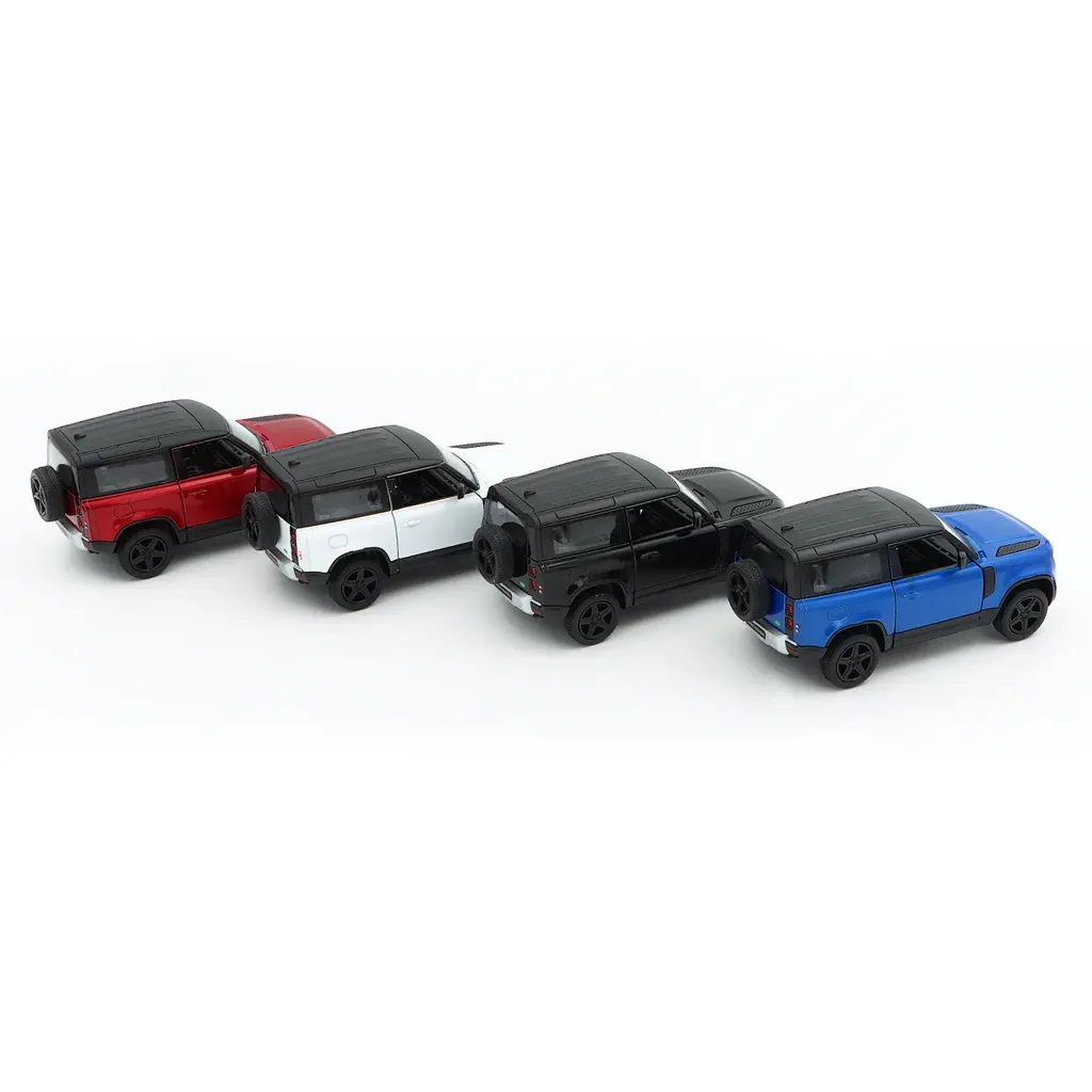 Land Rover Defender 90 från Kinsmart med öppningsbara dörrar och pullbackmotor.