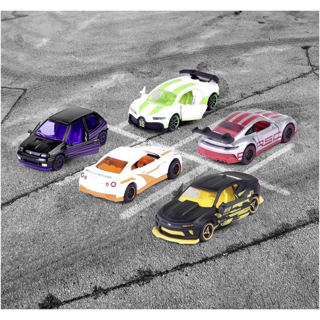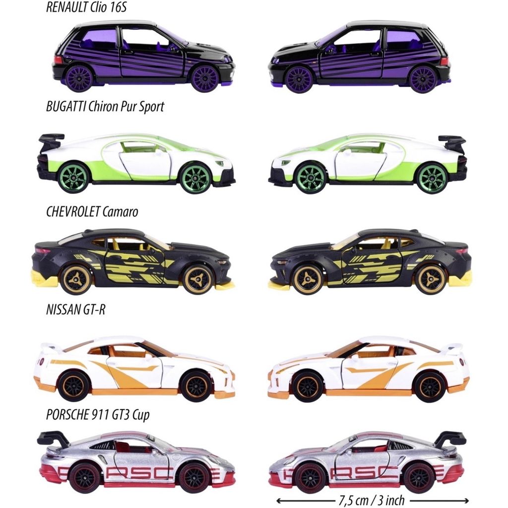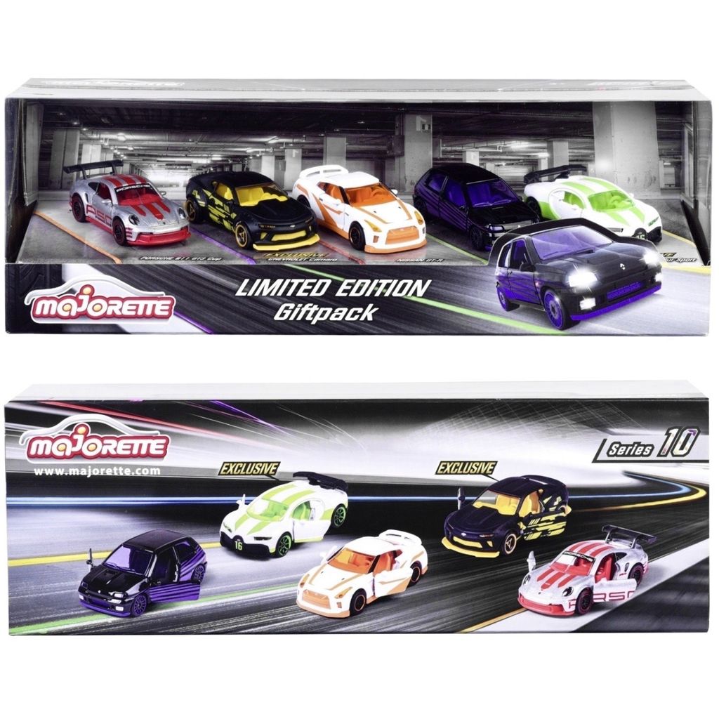 Set med fem sportbilar från Majorette i presentförpackning. Bilarna är ca 7,5 cm långa. Setet heter Limited Edition 10 och utgavs 2024.