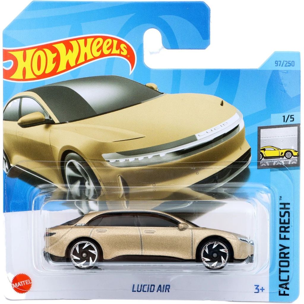 Lucid Air från Hot Wheels och serien Factory Fresh där denna leksaksbil är bil nummer 1/5. Bilen ingår i E-case 2023 (short cards / 5785).