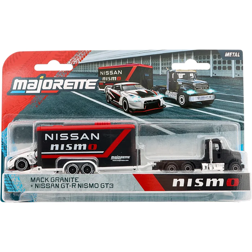 Race Trailer från Majorette med en Mack Granite från Mack Trucks som drar en täckt trailer med en Nissan GT-R Nismo GT3. Bilarna bildar raceteamet Nissan Nismo.