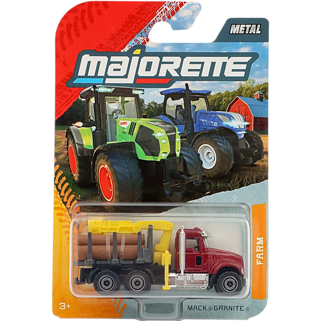 Mack Granite lastbil med timmer från Majorette och serien Farm Premium Vehicles. Lastbilen är ca 7,5 cm lång och är tillverkad i metall med plastdetaljer.