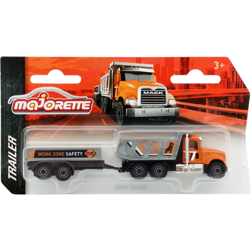 Lastbilsekipage från Majorette och serien Trailer där en orange Mack Truck Granite drar en tvåaxlad trailer.