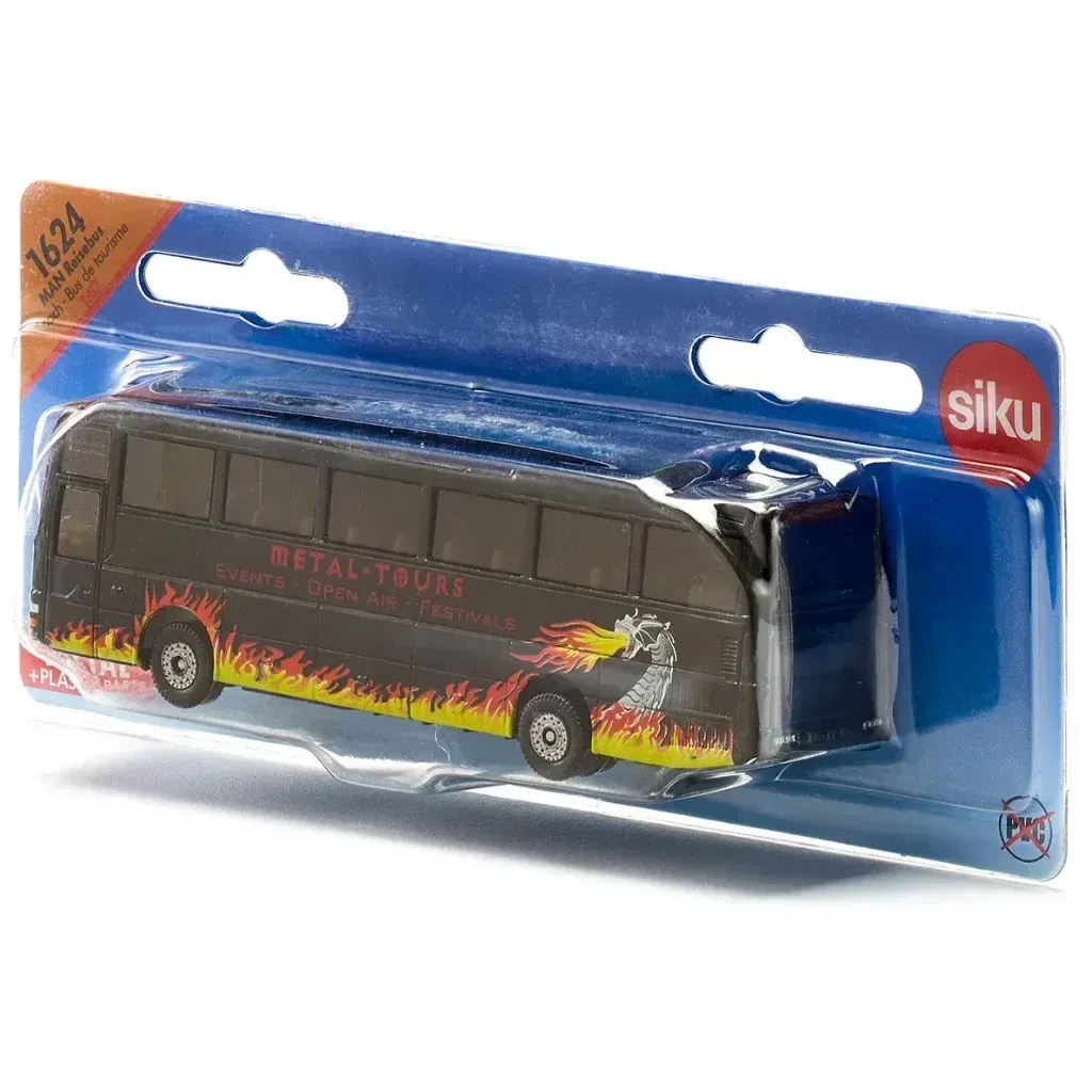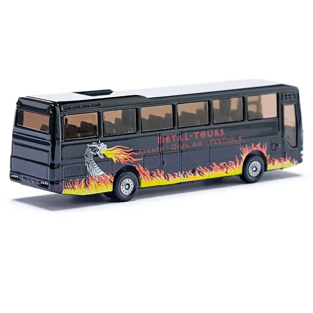 MAN Coach turistbuss i metall med metal-tema. Bussen är 13,6 cm lång (skala 1:87).