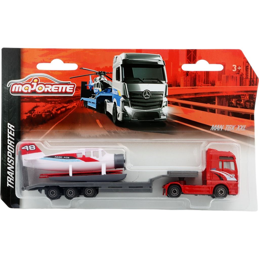 Dragbil med trailer från Majorettes serie Transporter. Dragbilen är en röda MAN TGA XXL och på trailern transporteras ett flygplan.