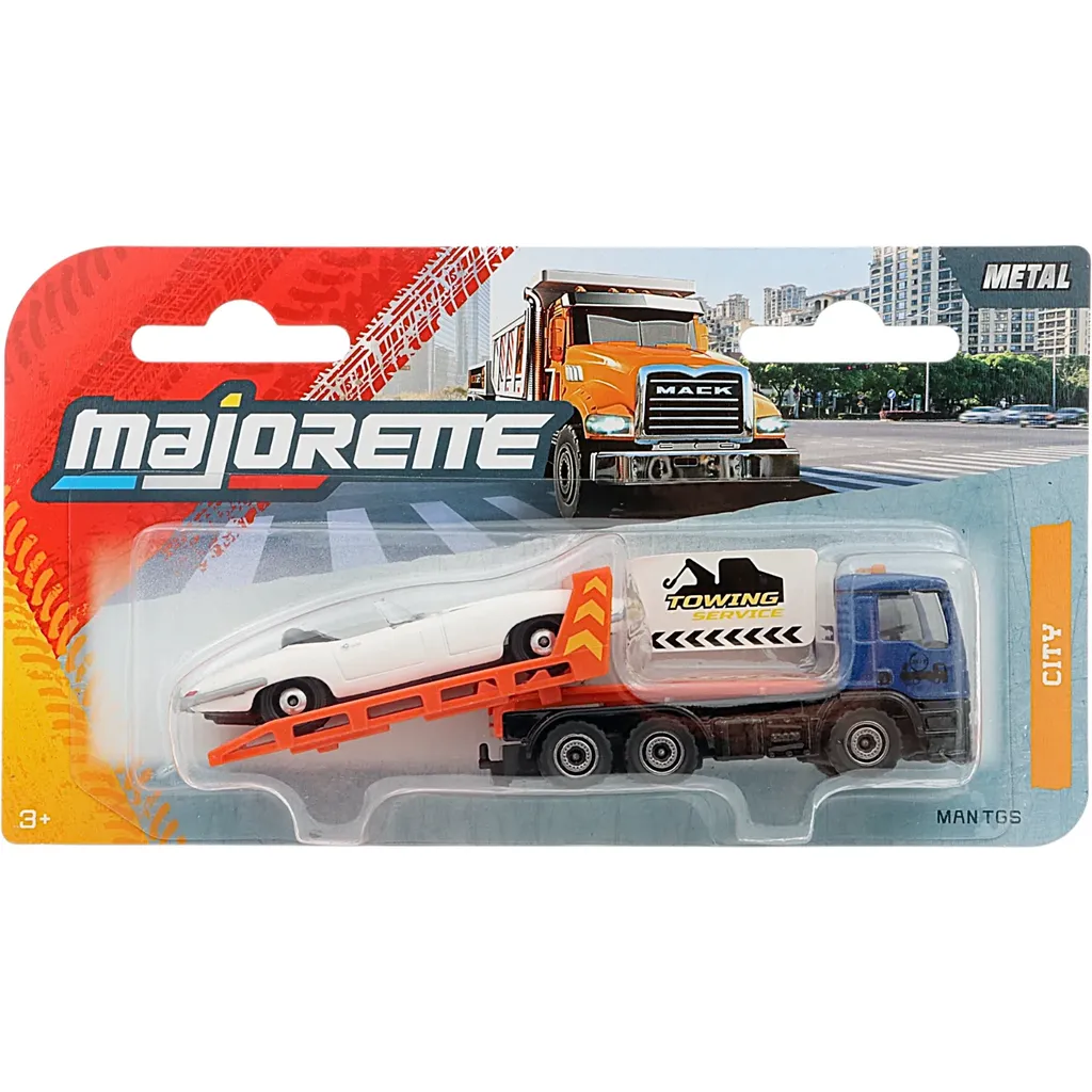 MAN TGS bärgningsbil med Jaguar E-Type Roadster på trailer från Majorette och serien City Trailer. Tillverkade i metall med plastdetaljer.