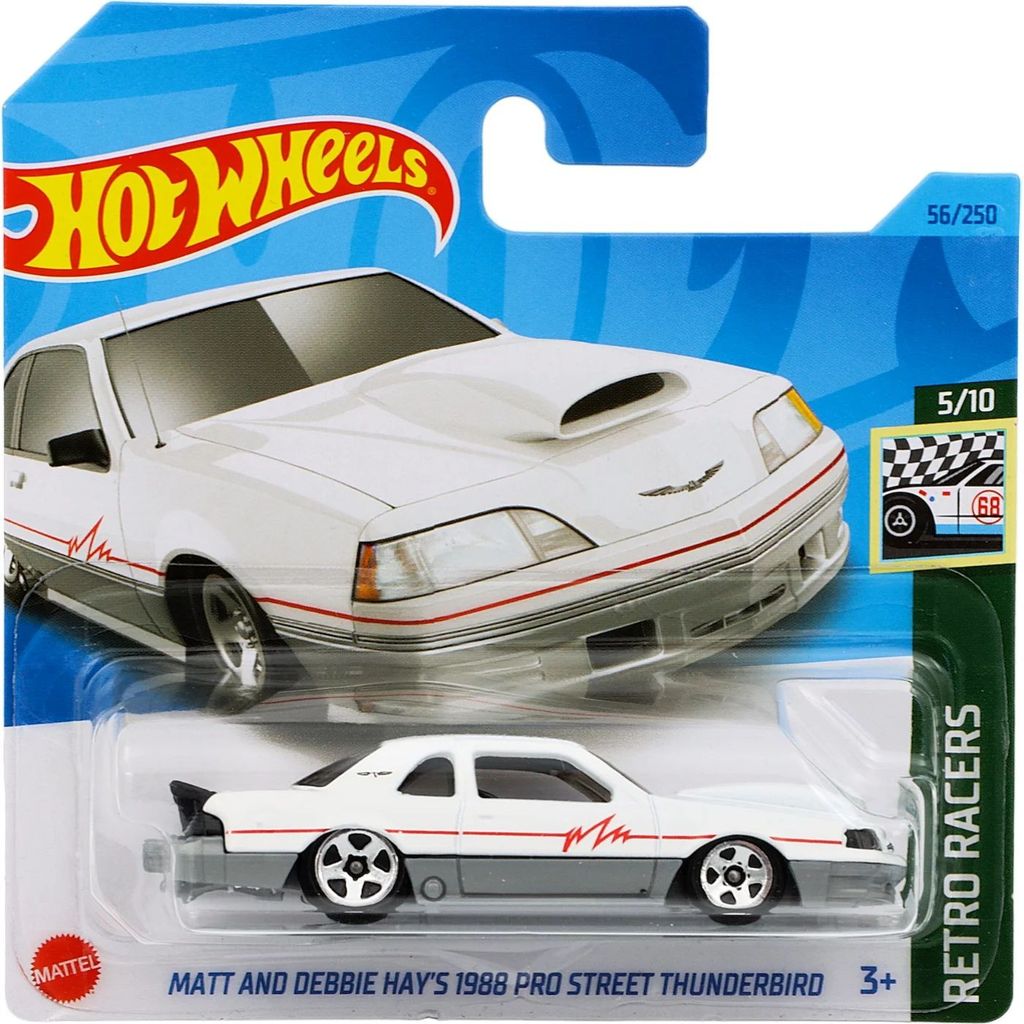 Matt and Debbie Hay?s 1988 Pro Street Thunderbird från Hot Wheels och serien Retro Racers där denna leksaksbil är bil nummer 5/10. Bilen är nummer 56/250 från 2023 och har ett short card (5785).