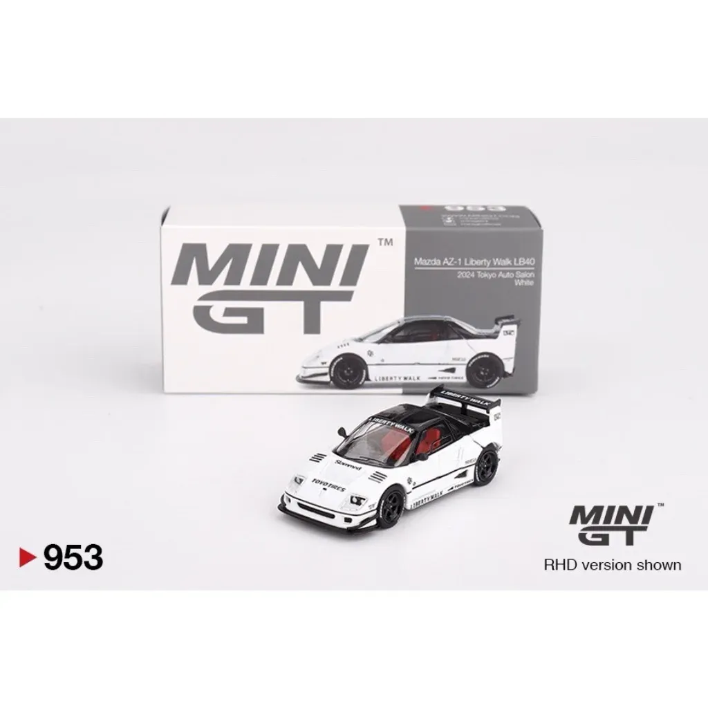 Mazda AZ-1 Liberty Walk LB40 2024 Tokyo Auto Salon som modell från Mini GT i skala 1:64 (ca 7 cm). Vit lack med ett body kit från Liberty Walk. Svarta tak, vinge och fälgar.
