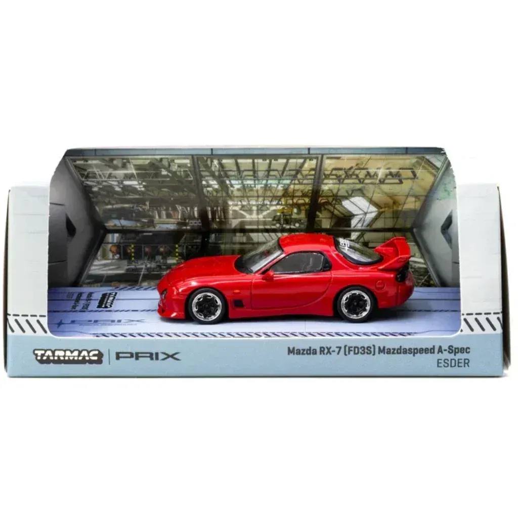 Mazda RX-7 (FD3S) Mazdaspeed A-Spec ESDER i röd lack från modellbilstillverkaren Tarmac Works. Denna modell ingår i Tarmacs serie GLOBAL64 och skalan är 1:64 vilket i detta miniformat kan översättas till 6,7 cm.