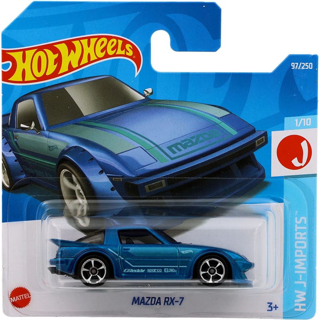 Mazda RX-7 från Hot Wheels och serien HW J-Imports där denna leksaksbil är bil nummer 1/10. Bilen är nummer 97/250 från 2022 och har ett short card (5785).