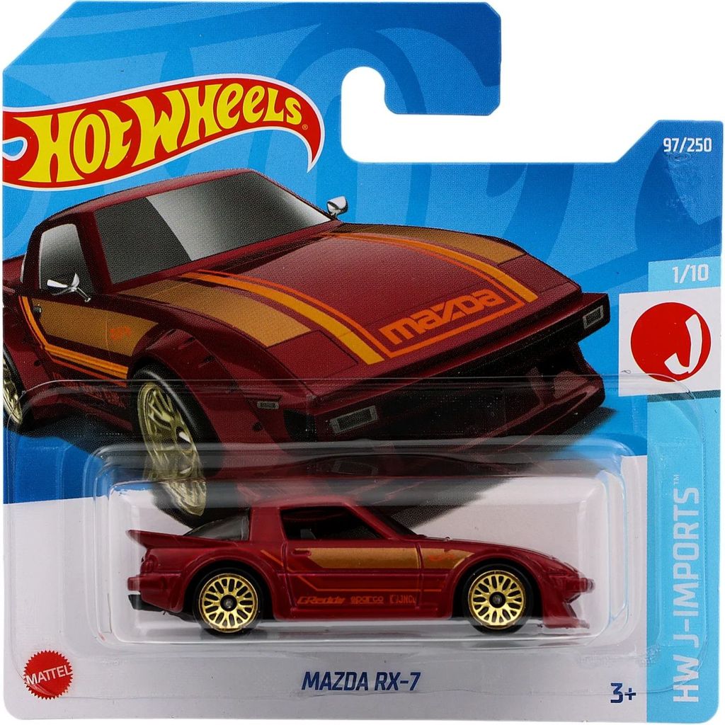 Mazda RX-7 från Hot Wheels och serien HW J-Imports där denna leksaksbil är bil nummer 1/10. Bilen är nummer 97/250 från 2022 och har ett short card (5785).