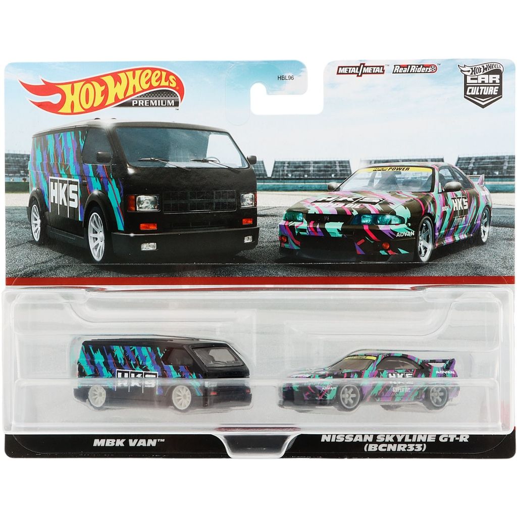 Två bilar i 2-pack från Hot Wheels. Bilarna är en MBK VAN och en Nissan Skyline GT-R (BCNR33). Båda bilarna har HKS-tema Dubbelpacket är en del av Hot Wheels serie Car Culture 2-Packs där detta pack är en del av Mix 2 (H) är från 2023.