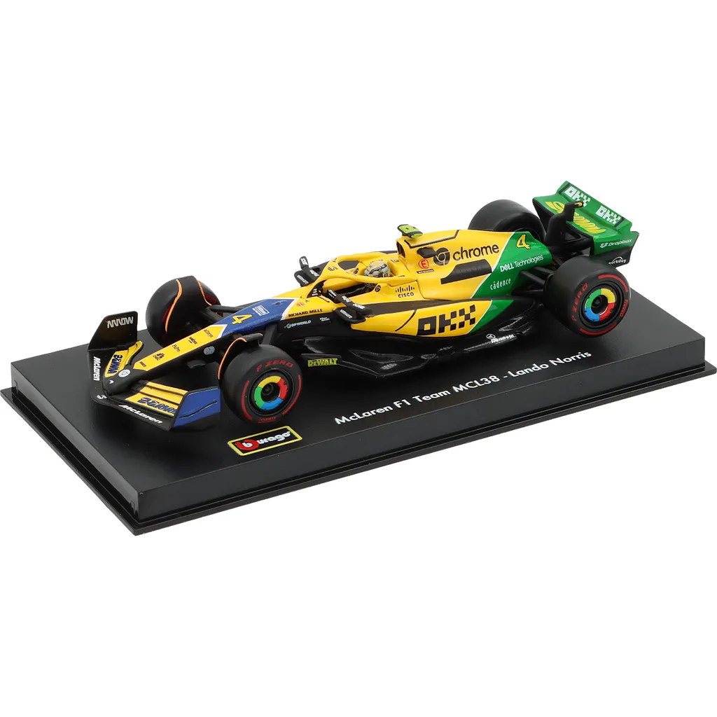 I den här modellversionen av MCL38 sitter Lando Norris bakom ratten med sin gula hjälm.