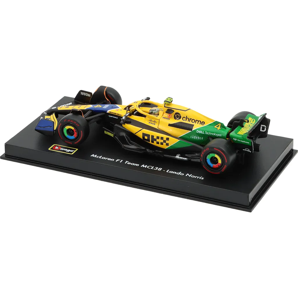 McLaren MCL38 med nummer 4 kördes av Lando Norris under Monaco Grand Prix 2024. Den här modellbilen är tillverkad av Bburago i skala 1:43 vilket innebär att den är 13 cm lång. Bilen levereras i en showcase.