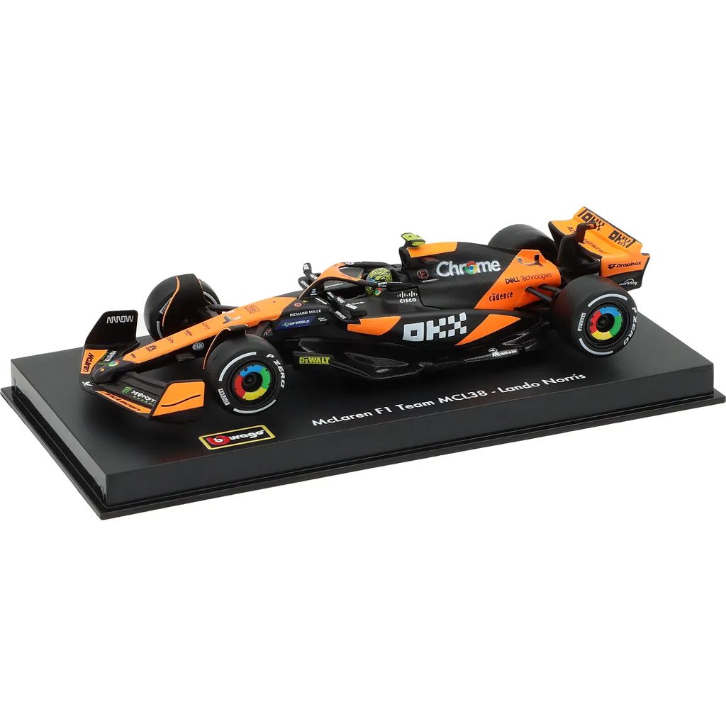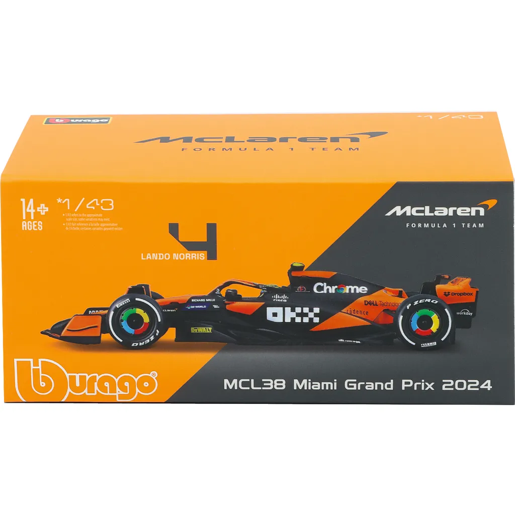 McLaren MCL38 med nummer 4 kördes av Lando Norris under F1-säsongen 2024 och just denna bil, med denna livery, kördes under Miami GP. Leksaksmodellen är tillverkad av Bburago i skala 1:43 vilket innebär att den är 13 cm lång. Bilen levereras i en akrylbox.