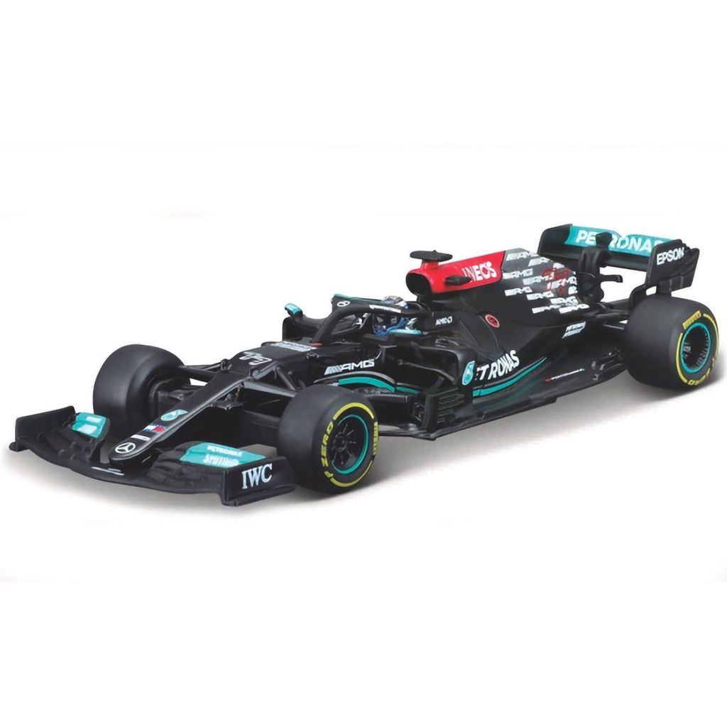 Mercedes-AMG F1 W12 E Performance i skala 1:43 från Bburago. Detta är en modell men den verkliga formel 1-bilen kördes av Valtteri Bottas 2021. Modellen har en förare (Valtteri Bottas) i bilen.