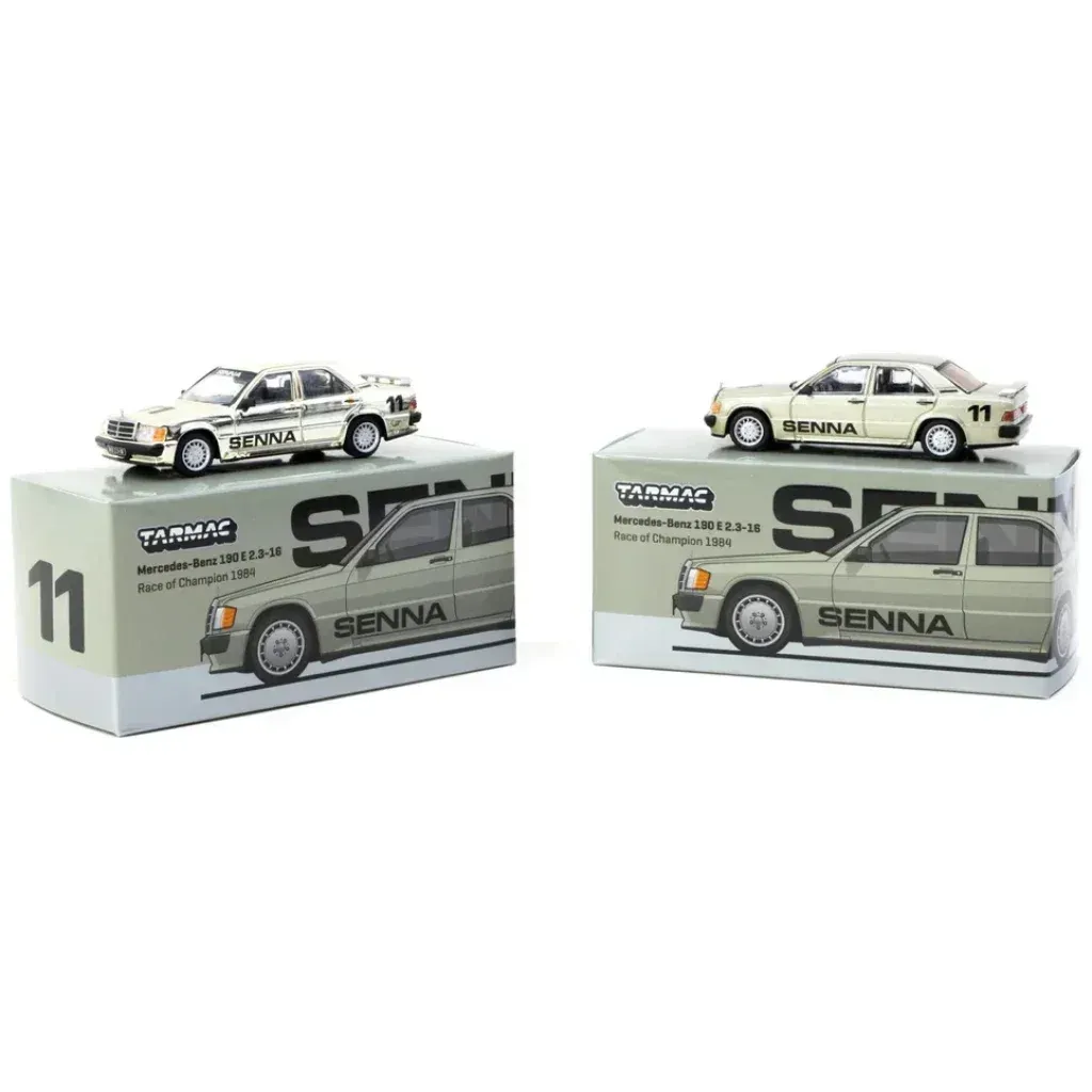 Mercedes-Benz 190 E 2.3-16 - Race of Champion 1984 - Ayrton Senna. Modellen är tillverkad av Tarmac Works och ingår i Tarmacs serie GLOBAL64. Skalan är 1:64 vilket i detta format kan översättas till ca 7 cm Mercedes-modell.