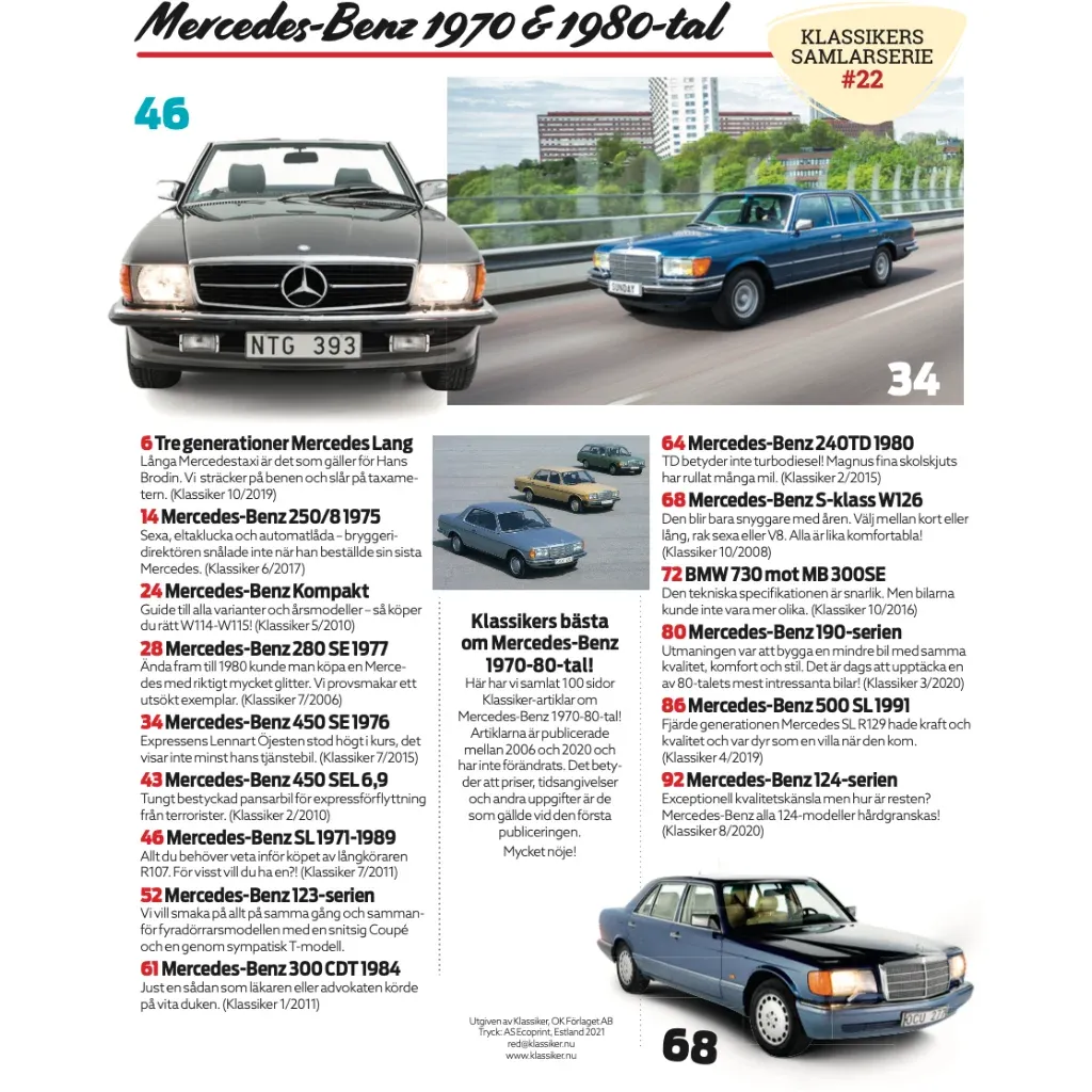 Tidningen är nummer 22 i serien Klassikers Samlarserie som utges av OK Förlaget. Tidningen innehåller artiklar från Klassikers produktion om Mercedes-Benz modeller från 1970- och 1980-talet.