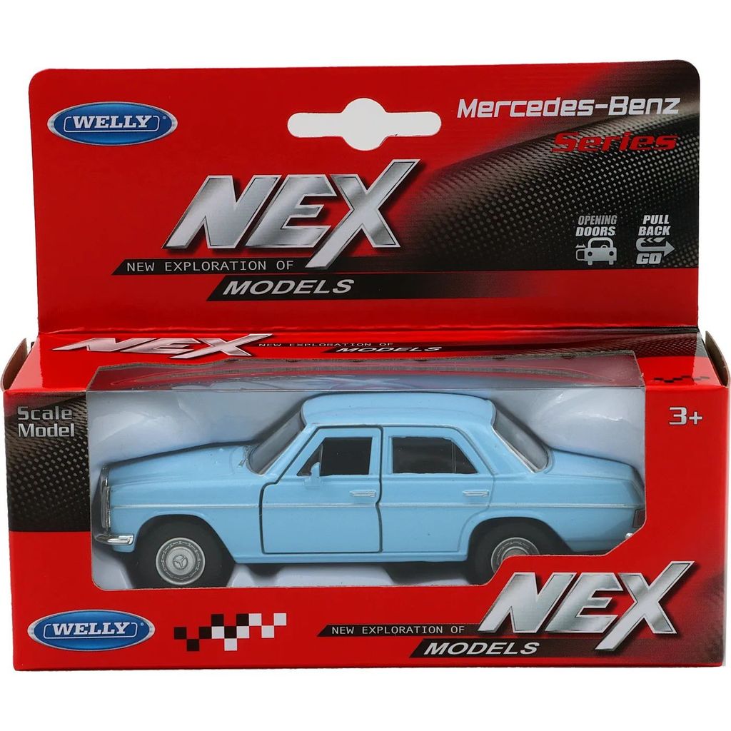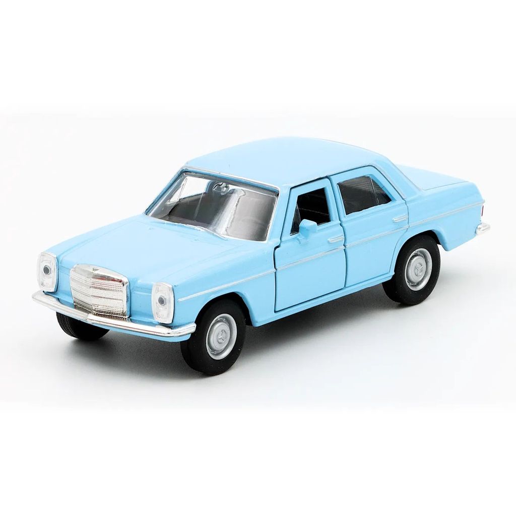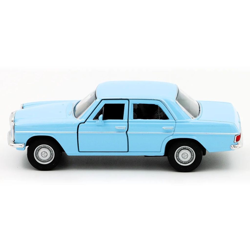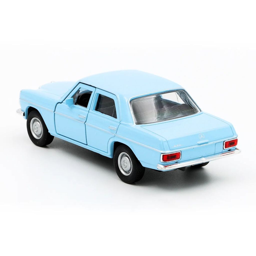 Mercedes-Benz 220 (W115) i ljusblått från Welly i skala 1:34 (11 cm) med pullback. Bilen är i metall och rekommenderas från 3 år.