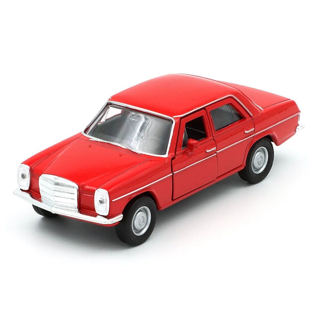Röd Mercedes-Benz 220 (W115) från Welly i skala 1:34 (11 cm) med pullback. Bilen är i metall och rekommenderas från 3 år.