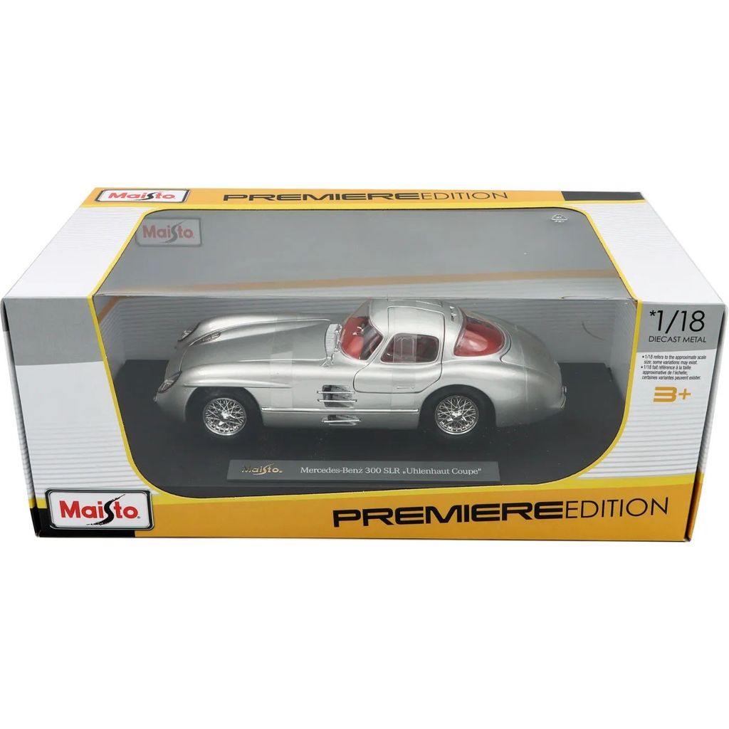 Mercedes-Benz 300 SLR "Uhlenhaut Coupe" i silver som modellbil i skala 1:18 (24 cm) från Maisto och serien Premiere Edition.