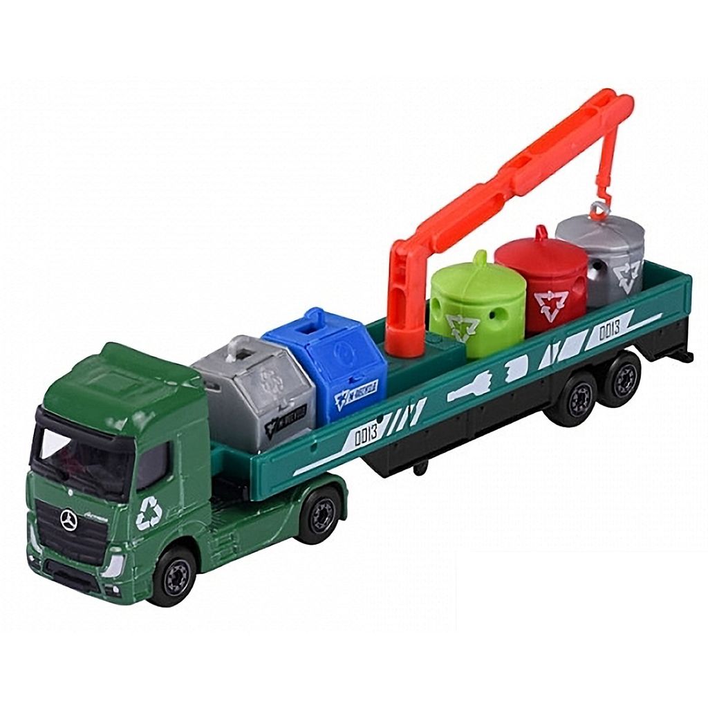 Från Majorette och deras serie Transporter kommer denna gröna Mercedes-Benz Arocs som drar en trailer med kran och fem återvinningsbehållare / containrar.