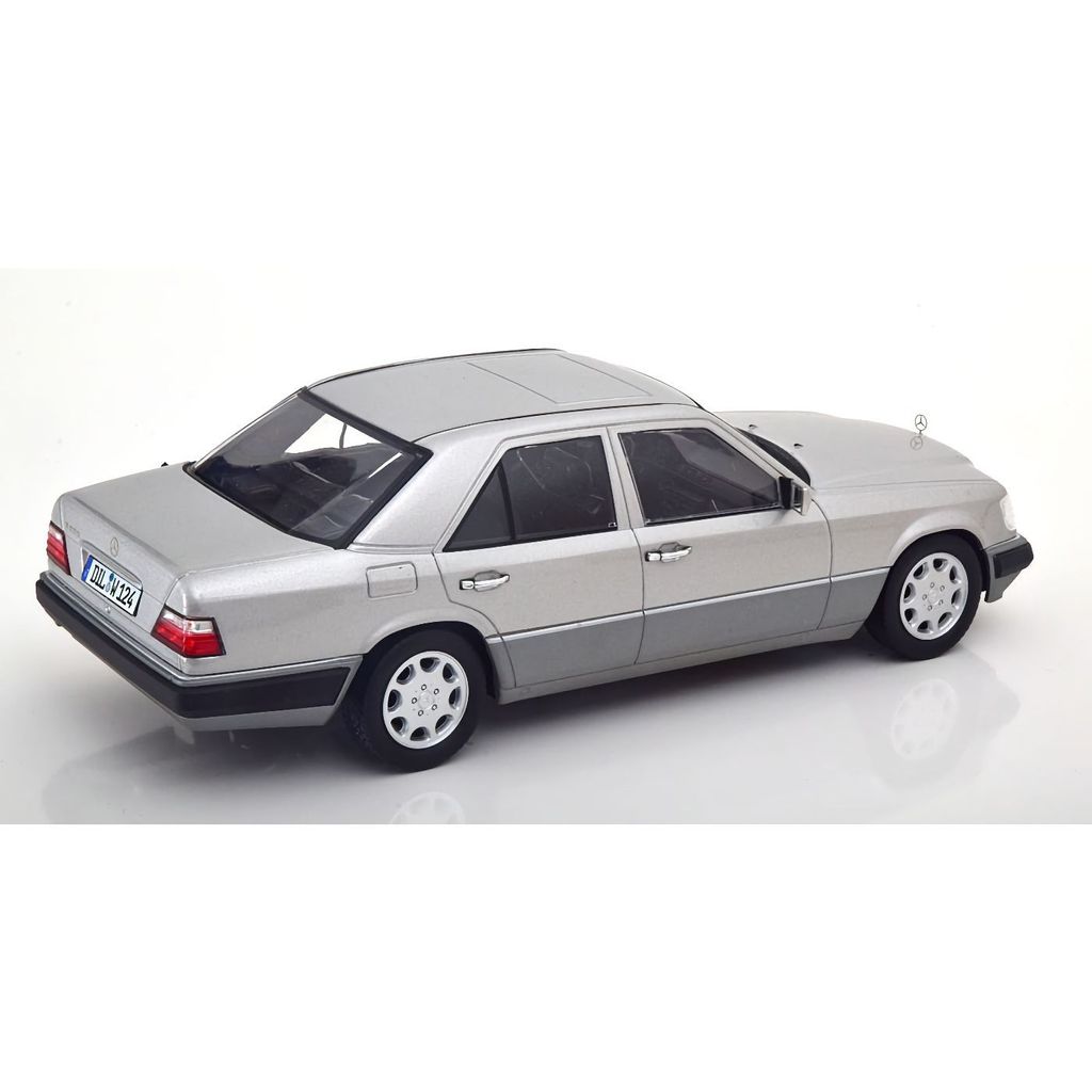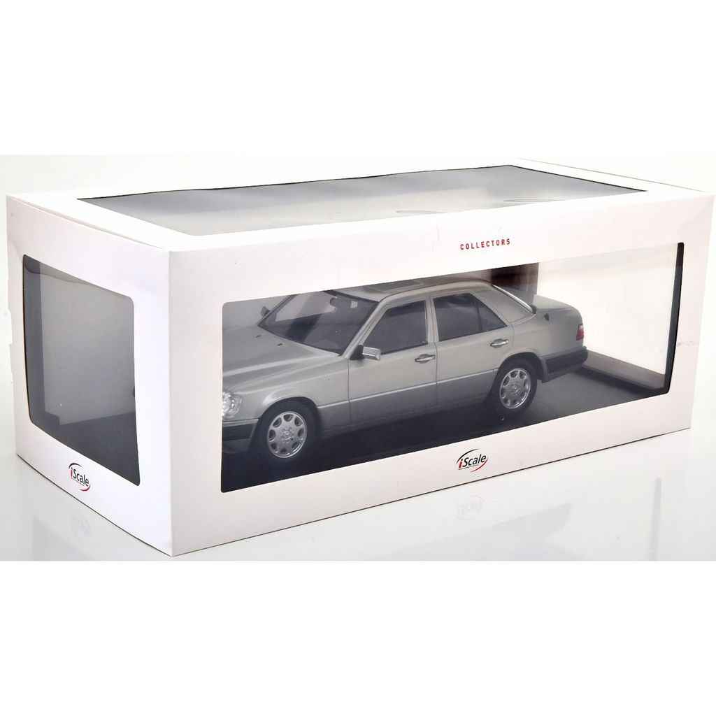 Modell från iScale i skala 1:18. Bilen är en Mercedes E-Class W124 årsmodell 1989 i silvermetallic.