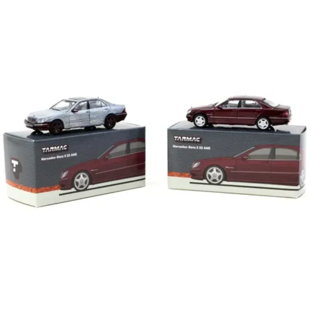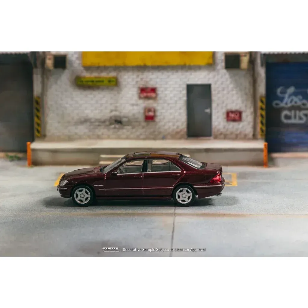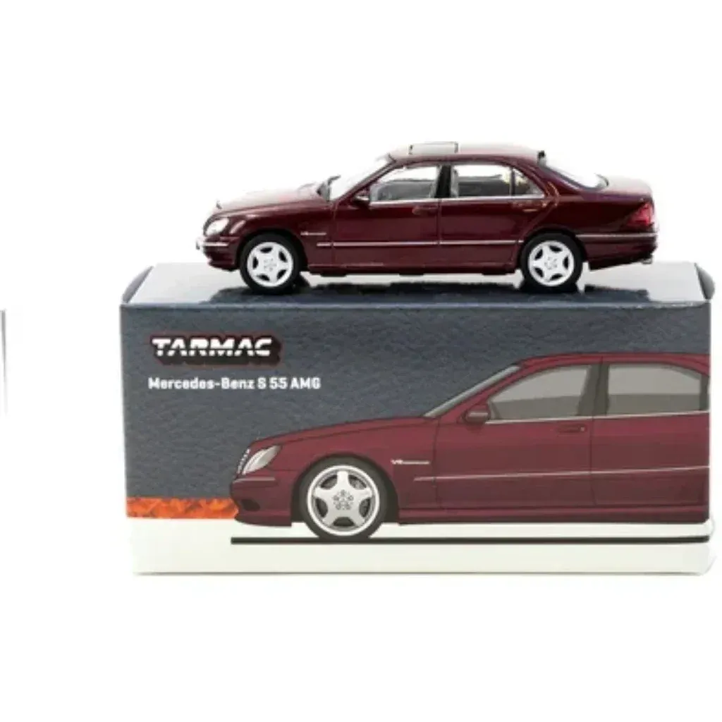 Mercedes-Benz S 55 AMG i rött (Bordeaux Red Metallic) från Tarmac Works i skala 1:64 (ca 7 cm). Bilen ingår i Tarmacs serie GLOBAL64.