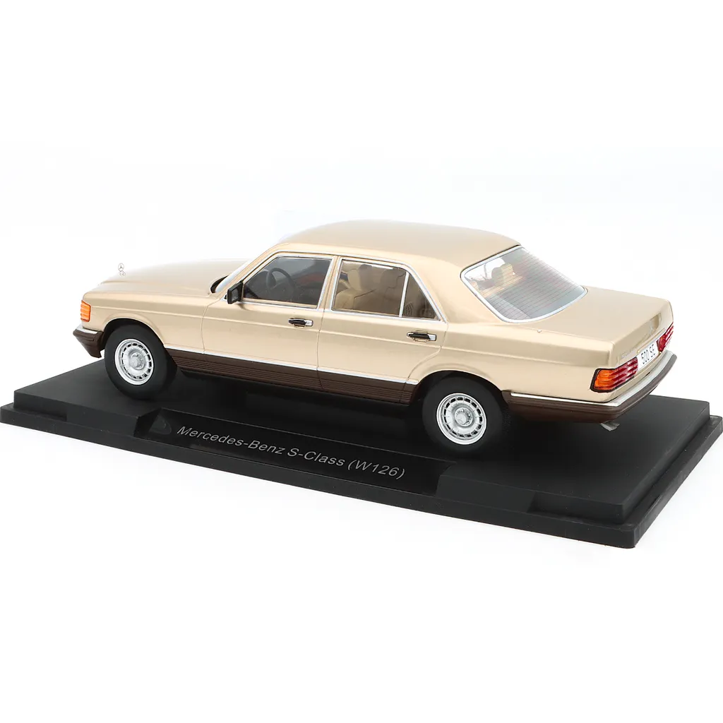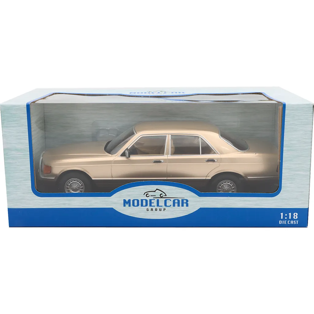 Mercedes-Benz S-Class (W126) med en beige metalliclack (blir åt det guldiga hållet) som modellbil från Modelcar Group i skala 1:18 (längd 28,5 cm). Årsmodellen är 1979.