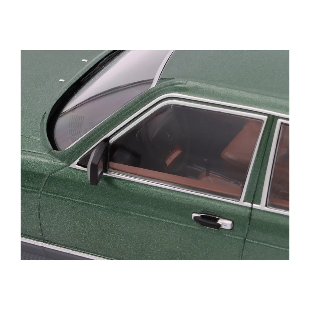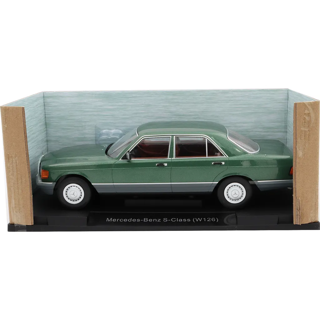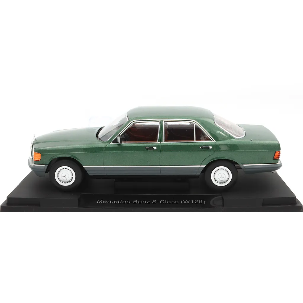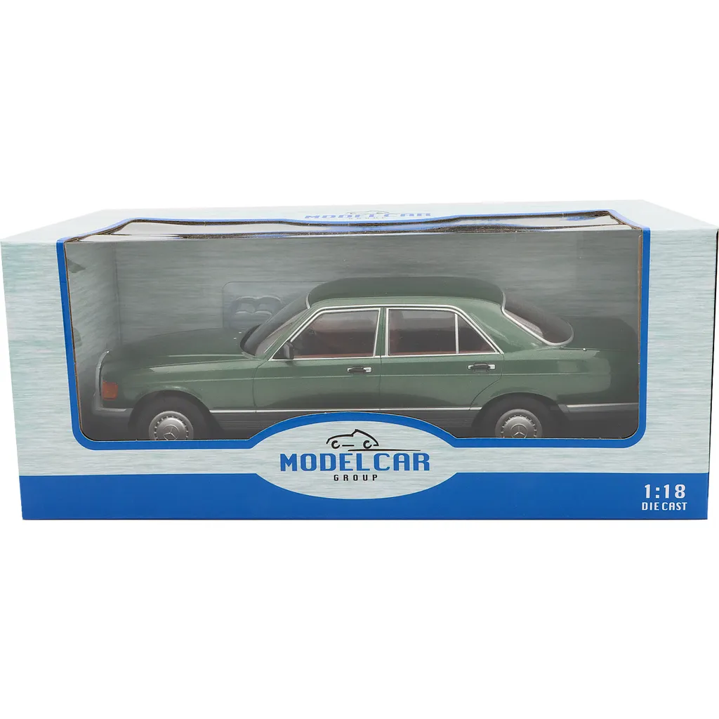 Mercedes-Benz S-Class (W126) med en mörkgrön metalliclack som modellbil från Modelcar Group i skala 1:18 (längd 28,5 cm). Årsmodellen är 1979.