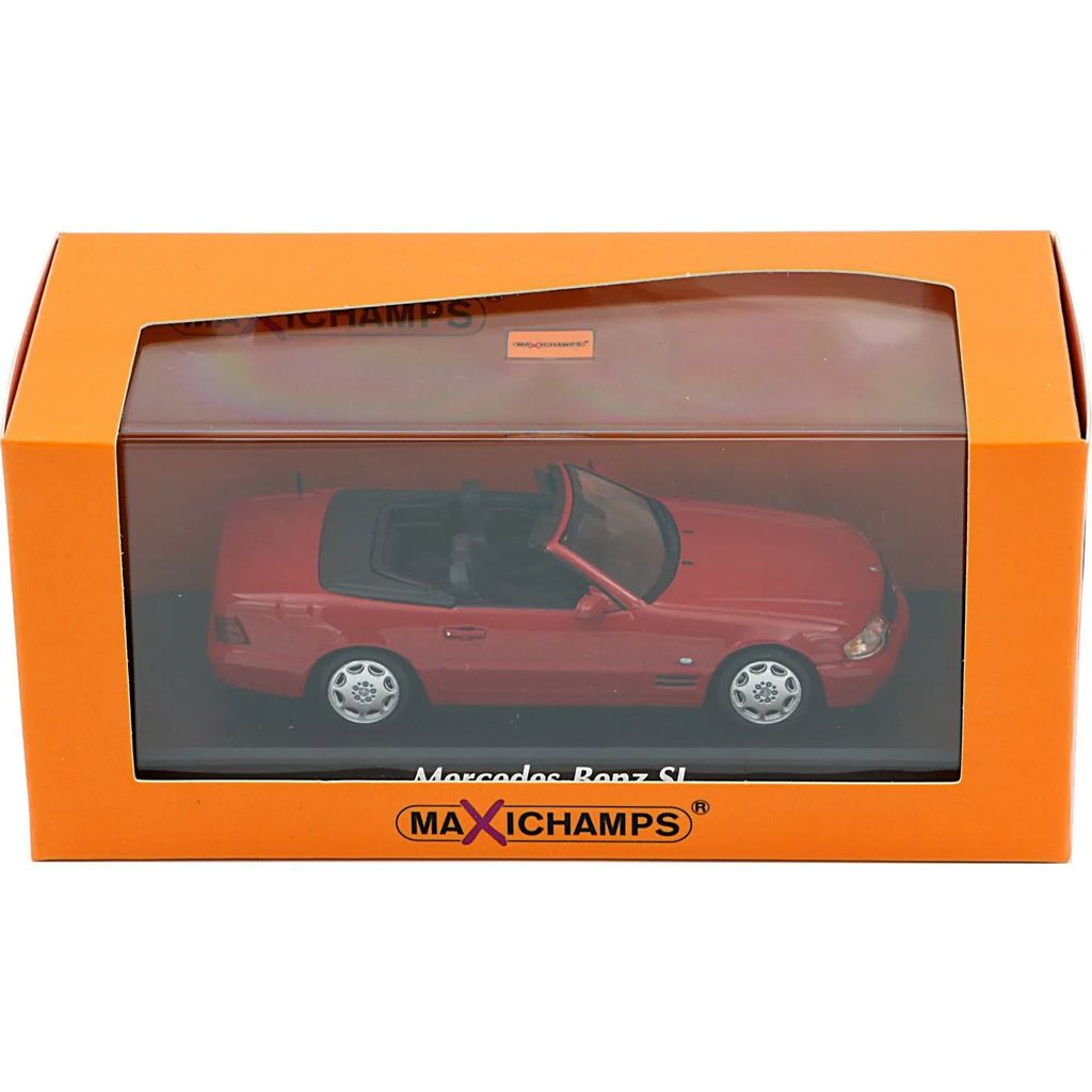 Röd Mercedes-Benz SL-Class (R129), årsmodell 1999, från Minichamps och deras serie Maxichamps i skala 1:43 (10,5 cm).