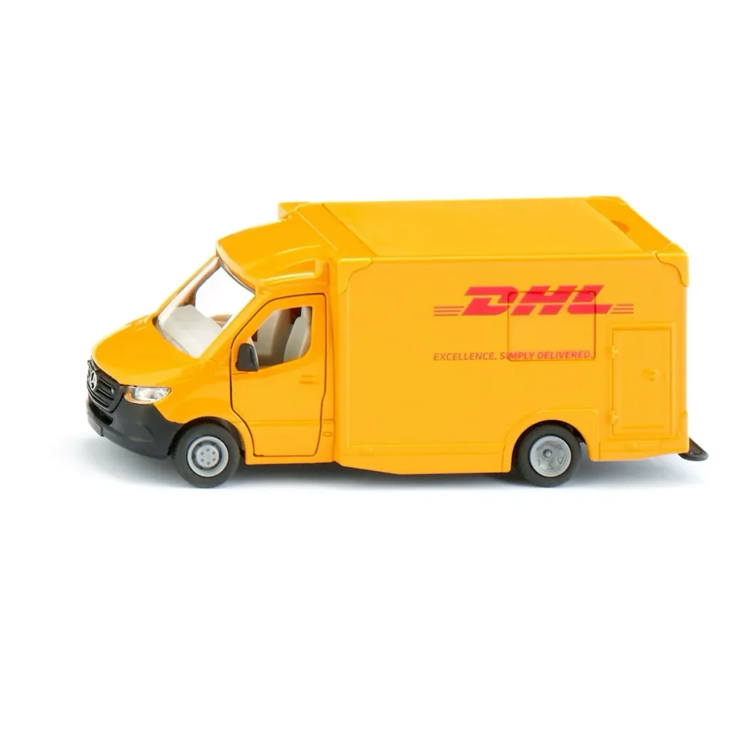 Mercedes-Benz Sprinter som paketbil från DHL med flera öppningsbara dörrar. Bilen är tillverkad av Siku i skala 1:50 (12,5 cm).